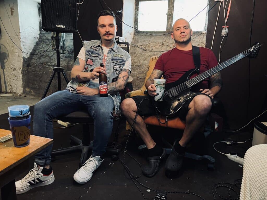 Geri: A fent említett progiban lévő dobgépbe bepötyögök valamit, jönnek a riffek, majd Szilkóval ezeket összerakjuk… ő is hozzárakja a tilinkóit. Van, hogy egyből megszületik a kis dead. Márk meg általában gyorsan kitalálja rá a torokcuccot.