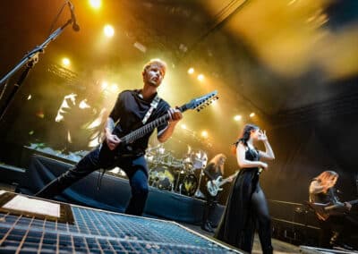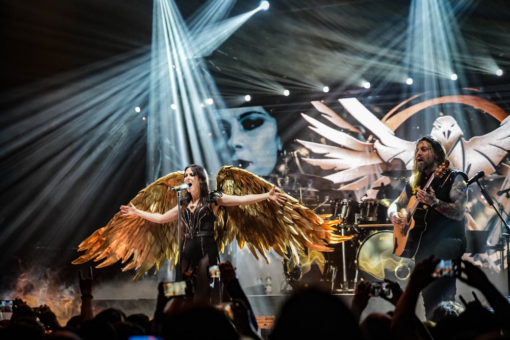A következő dalban, amely az újalbumos Ravens volt, a fronthölgy két hatalmas szárnnyal a vállán tért vissza a színpadra, Chris pedig akusztikus gitáron adta elő a néha disszonáns, és ettől rendkívül érdekes témákat. Amúgy maga a dal szerintem annyira nem volt fülbemászó, a végére azonban Chris élő vokáljainak és a hangszerelés tetőfokára hágásának köszönhetően elég libabőröztetőre sikerült. Talán ez után jött Jennifer beszéde arról, hogy ma mindenki össze van kötve az internet által, és mégis, a való életben mennyire elszeparálódtunk egymástól: ezzel vezette fel a The Flood című dalt (ha jól emlékszem legalábbis). Az újabb szerzeményeket egy régebbi sláger, a Lost In Forever követte az azonos című albumról.