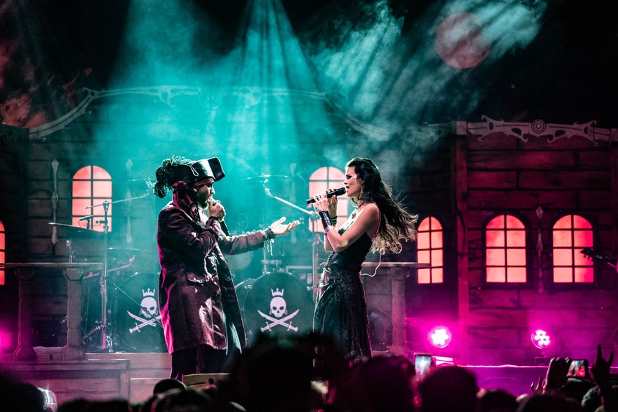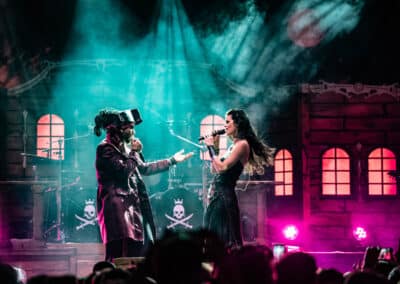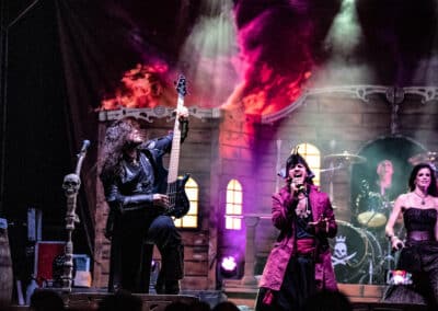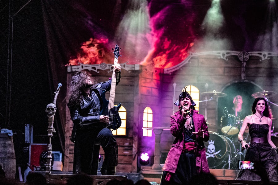 Az est fő attrakciója, a Visions of Atlantis végre lerántotta a leplet a hatalmas díszletekről, ami az előttük játszó zenekarok terét úgy elfoglalta. A színpadon így előbukkant egy nagy, sokablakos kastély (?), két koponyás-csontvázas mikrofonállvány, később pedig lampionok és egy „VOA”-feliratos zászló is. Clémentine Delauney francia énekesnő nyitotta meg a műsort gyönyörű szopránjával – ezúttal abszolút meggyőzött az operás ének. A hangzásuk nekik is jó volt, a dalaik slágeresek, a színpadon mindig történik valami, így a produkció teljesen leköti a figyelmet. Pár szám elteltével érkezett meg a színpadra a férfi ének az olasz Michele Guaitoli jóvoltából. Ő is igen kiváló énekes, azonban mintha az önbizalma nem lenne maradéktalan, ugyanis néha előfordult, hogy halkabban hallatszott az éneke, vagy esetenként egyáltalán nem. Láttam, hogy a magasabb hangoknál olyan távol kapja a mikrofont, hogy az már jelet se kap. Amikor nem láttam rendesen a színpadot az embertömegtől, olyan érzetet keltett Michele szaggatott éneklése, mintha kontaktos lenne a mikrofonkábel – csak az a bökkenő, hogy wirelessbe énekelt…