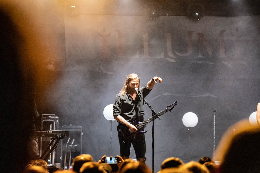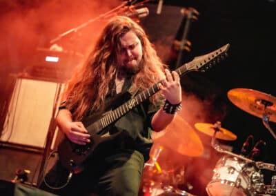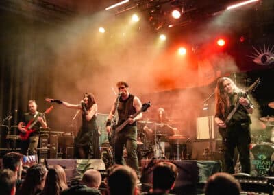 Az Illumishade amilyen szép színpadképet hozott, gyönyörű színekkel és fényekkel, világító gömbökkel, szemrevaló tagokkal, olyan nevetségesen festett a Visions of Atlantis magas díszletei mögül éppenhogy kikandikáló molinójuk, aminek csak a felét lehetett elolvasni… Na nem baj, erről hamar elvonta a figyelmet a zenekar. Fabienne Erni (aki az Eluveitie zenekar énekesnőjeként vált ismertté) imádnivaló karaktere, színpadi jelenléte, szinte állandó mosolya és kitűnő éneke egyből magára vonzza a figyelmet. Az egyik számban még azt is hallani véltem, hogy growlol, és ahogy kivettem, más zenekartag nem lehetett. A szintén az Eluveitie zenekarból érkezett Jonas Wolf gitáros mély riffekkel, djentes témákkal örvendeztetett meg – húúúú, de jól szóltak!! Wolf egy gitárriff-kvízzel is előállt, eljátszotta a Judas Priest egy riffjének rövid részletét (sajnos a dal címére nem emlékszem – Living After Midnight?), és ennyi is elég volt a közönség (legalább) egyik tagjának, hogy azonnal kitalálja, melyik számról van szó… És ezzel nyert egy felvarrót. Előkerültek itt is gyönyörű hangszerek, sokhúros, lilán ragyogó gitárok és basszusgitárok…