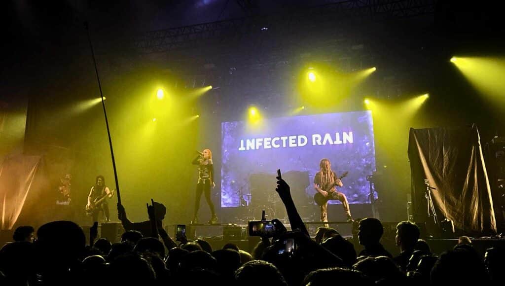 A Moldovában alakult Infected Rain koncertjére érkeztem meg a helyszínre, ami már ekkor tömve volt. Nagyon jól szólt a zenekar, sötét tónusú mélyekkel, súlyos gitársounddal – ami pedig nem mindig mondható el az előzenekarok hangosításával kapcsolatban. Lena Scissorhands (avagy Elena Cataraga) nagyon jó frontember, végig érződött rajta a rajongók iránti szeretet, még egy circle pitre is meginvitálta a lelkes közönséget. Az énekesnő többször olyan közel jött a tömeghez, amennyire csak tudott, és egyszer csak fogta az egyik, épp őt videózó rajongó telefonját, és sajátkezűleg folytatta a kamerázást.