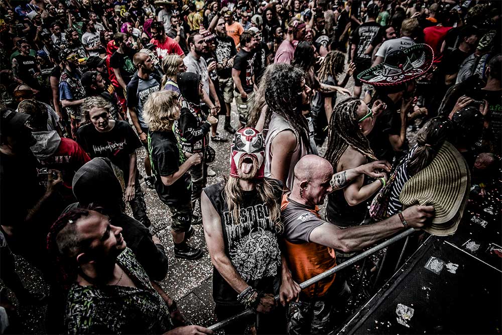 Itt meg is említeném az Obscene Extreme Festival egyik sajátosságát: a Bojiste területén egyetlen színpad van, de azon délelőtt 10 órától hajnali 2 óráig (az utolsó éjjelen 3-ig) vannak koncertek. Ez azt jelenti, hogy a pár ezer főnyi fesztiválvendégből minimum 100, de inkább 200 ember már a reggel 10-kor kezdődő nyitóbandák koncertjére odamegy. Ha süt a nap, ha esik az eső. Ezt pedig hagyományos városi rendezvényhelyszínek nem tudják garantálni. Erre tökéletes az OEF. Reggel 10-kor 200 ember ott van bármely noname (bocsánat: underground) crust punk, vagy grindcore, vagy bármilyen banda koncertjén az OEF színpadánál. És a reggel 10-es bandák is olyan elánnal őrjöngenek a színpadon, mintha a Napalm Death előtt játszanának 5000 embernek.
