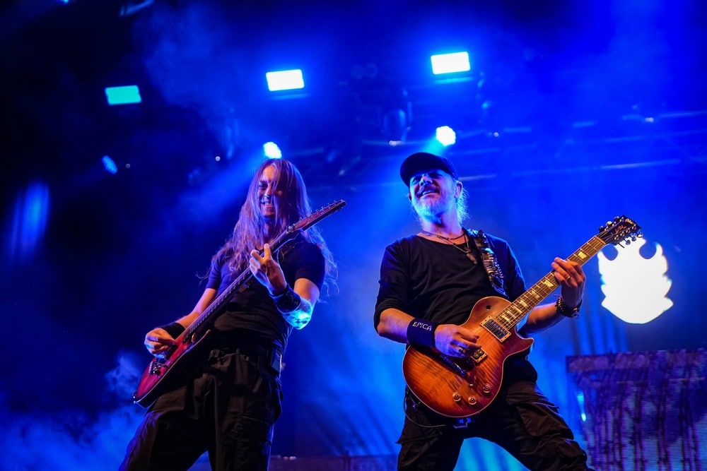 Az Epica koncertjének kezdete előtt persze kicsit besűrűsödött a tömeg, úgyhogy haverommal taktikai pisit követtünk el, mert ekkor már tényleg egyre nehezebb volt a kijutás-helyezkedés. A holland szimfonikus metal csapat színpadi díszlete izgalmas volt: több állvány is előkerült – először azt hittem, a középső, legnagyobbat kapja a dob, de tévedtem, a dobos a rendezői jobbon foglalt helyet egy kisebb állványon. (Pedig tavaly láttam őket élőben, de hát ki tudja, mit változtatnak.) Aztán a dekoratív mikrofonállványok tűntek fel, főleg Simone Simons énekesnőé: a hajlított rudat ornamentális elemek díszítették.