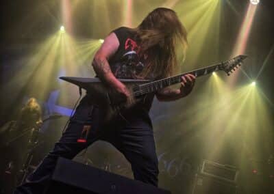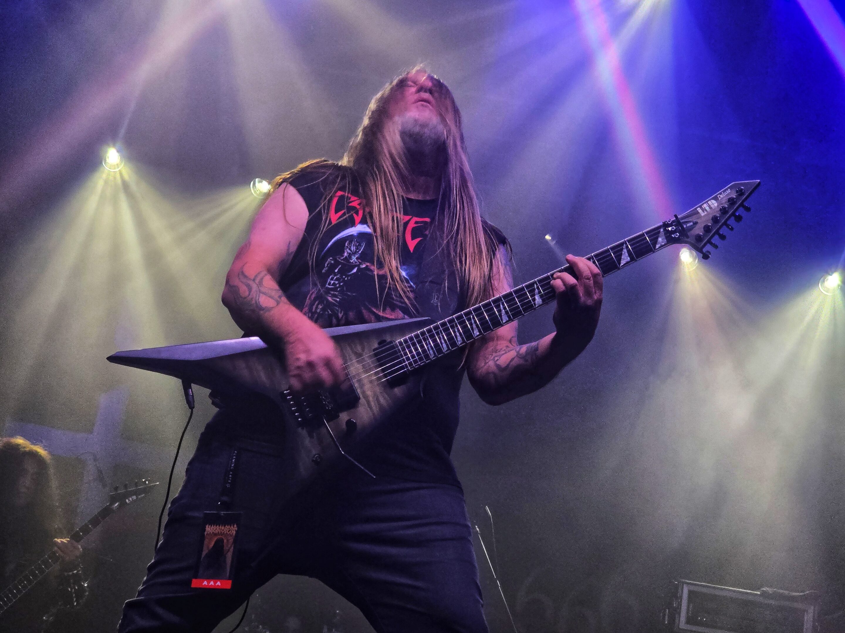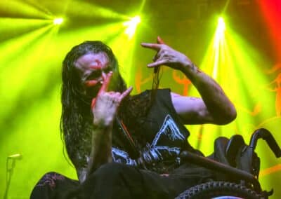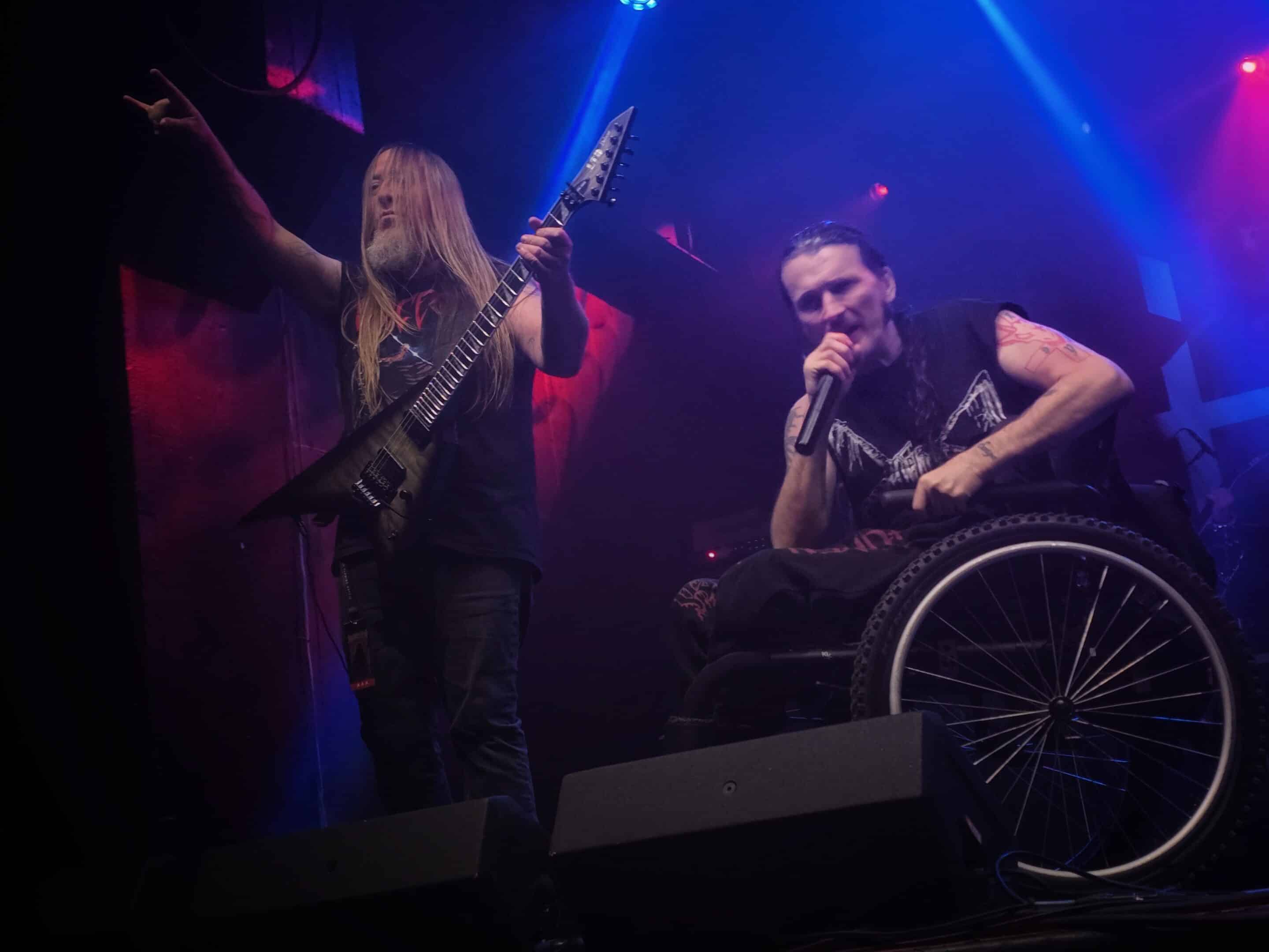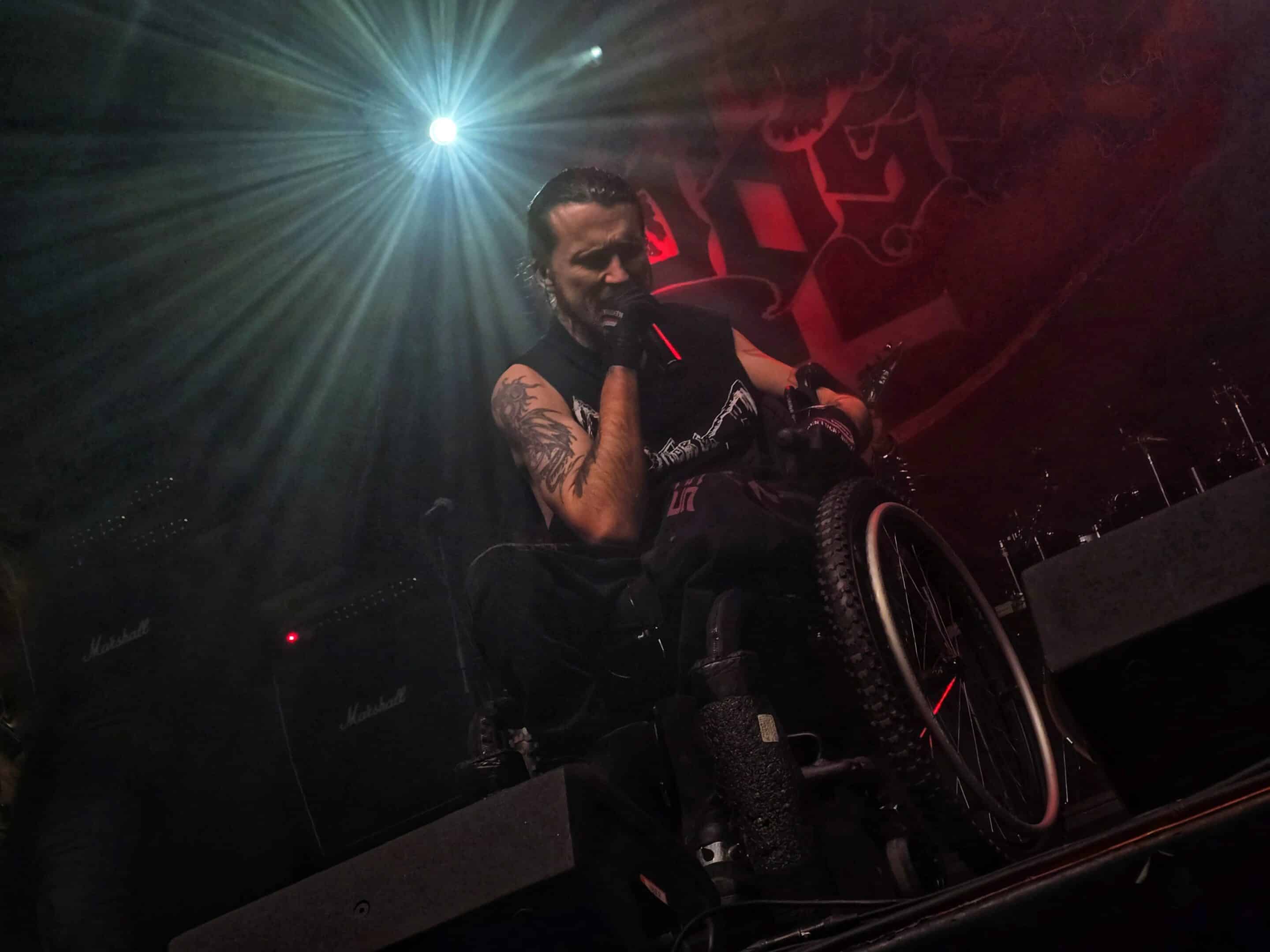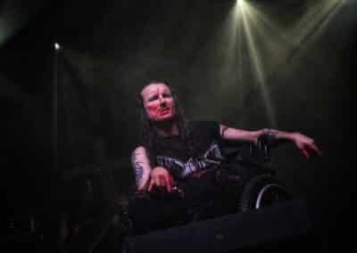 A Terrorizer után a Possessed következett. Tudom, hogy egy régi legendás és ikonikus bandáról van szó, de nekem ők kimaradtak az életemből idáig. Hallani is onnan hallottam róluk először, amikor szeptemberben kint voltam Poznanba és beszélgettem egy sráccal. Ő mondta, hogy a Possessed koncert lesz neki a következő mert még nem látta őket és meg akarja nézni mivel nem tudható, hogy az énekes állapota miként és hogyan alakul. Ekkor gyorsan rá néztem / kerestem, hogy ki is az a Jeff Becerra. A bepakolás közben már találkoztam Jeff-fel és látszik rajta, hogy megviselte az élet. Tény, hogy egy mellkastól lefelé való lebénulást én még droggal és alkohollal se tudnék elviselni. Úgyhogy hatalmas respect előtte! Volt elvonón, de látszott rajta, hogy vagy iszik, vagy használ valamit mert fura volt és kissé zavartnak tűnt. Feljöttek a színpadra és megkezdődött a koncert. Látszott rajta, hogy mennyire boldog és a többi tag is 100%-os erőbedobással játszott egész végig. Nagyon nem lehet egyszerű kerekesszékben zenélni pláne, ha mellkastól lefelé nem tudsz mozogni. Kemény volt. Látszott sokszor, hogy gyorsan oda menne valahova, de a kerekek nem mindig úgy engedelmeskedtek, ahogy kellett volna és megakadtak valamiben. Volt, hogy a gitárosok segítettek neki, akik a koncert teljes ideje alatt figyeltek rá. Jeff a koncert közben elővett egy zacskót amieben Possessed felvarrók voltak és azokat kezdte el bedobálni a közönségnek. Sikerült egyet elkapnom nekem is, ami még dedikálva is volt általa. Persze ettől a cselekedettől a közönség még jobban belelkesedett. Akármennyire is látszott rajta, hogy nem egyszerű neki mozogni a színpadon, külön pozíciót kellett felvennie, hogy énekelni tudjon. Ennek ellenére is láthatóan boldognak tűnt, jól érezte magát. Integetett, nevetett, metal-villázott és rengeteget kontaktolt a közönség tagjaival, akik ezt kitörő örömmel fogadták. Szerencsére itt már a hangosítás is szuper volt, ezáltal mindent jól lehetett hallani az énektől a gitárokon át egészen a dobig. Hiába a csúszás, ami itt a végére már átlépte az egy órát, a koncert zavartalanul lezajlott.