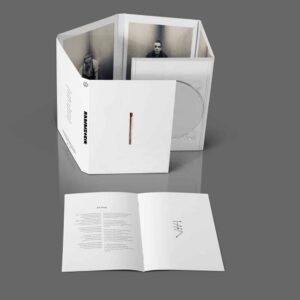 Dupla, 180g-os fekete bakelit, aranyszínű dombornyomott logóval és nagy 20 oldalas füzettel.