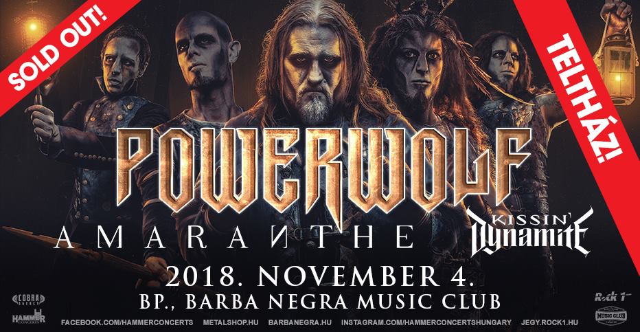 Az idei Rockmaraton Fesztivál egy headliner csapata, a Powerwolf ebben az évben duplikál, legalábbis, ami a magyarországi bulikat illeti. A jellegzetes szövegvilágról, és hangzásról ismert csapatnak idén júliusban jelent meg legújabb nagylemeze, a „The Sacrament of Sin„, amit úgy tűnik, alaposan megturnéztatnak, bár a lemezt hallgatva ez nem is csoda. A Rockmaraton Fesztivál után novemberben a Barba Negra Music Club színpadán játszanak az Amaranthe, és a Kissin’ Dynamite társaságában, ám a rossz hír, hogy a rendezvényre hivatalosan is minden jegy elkelt, úgy, ahogy az Európa-turné számos állomásán is! Aki eddig nem szerezte be a jegyét, kövesse figyelemmel az esemény hivatalos oldalát, ahol találkozhat fel-fel bukkanó eladó jegyekkel. Figyelem! Csak megbízható forrásokból szerezzétek be a belépőtöket!