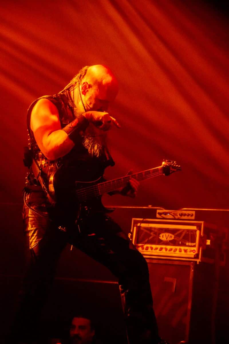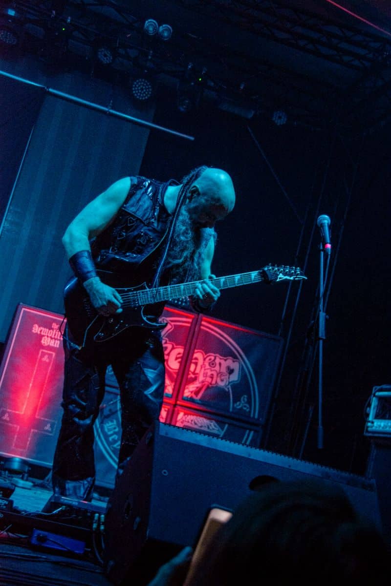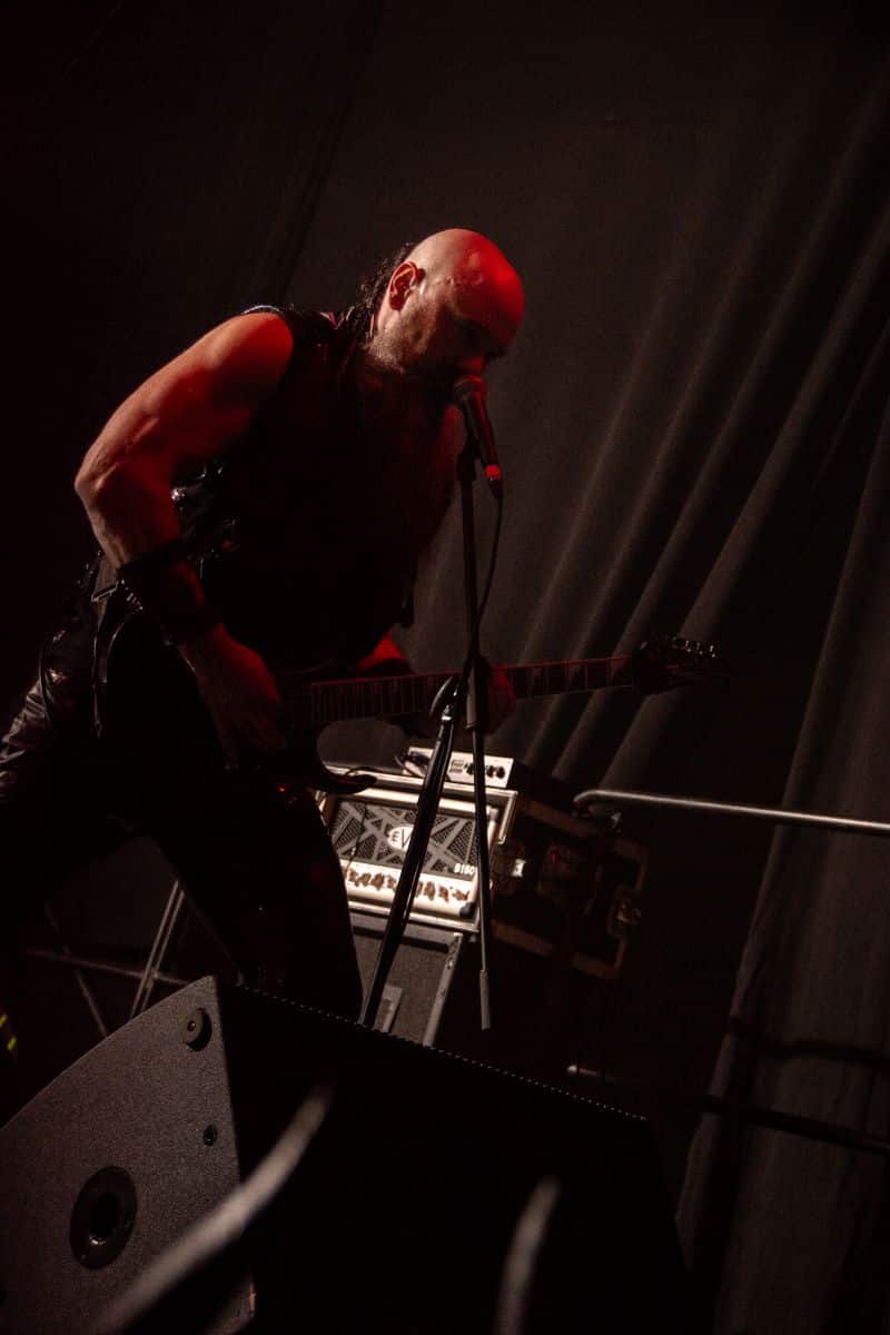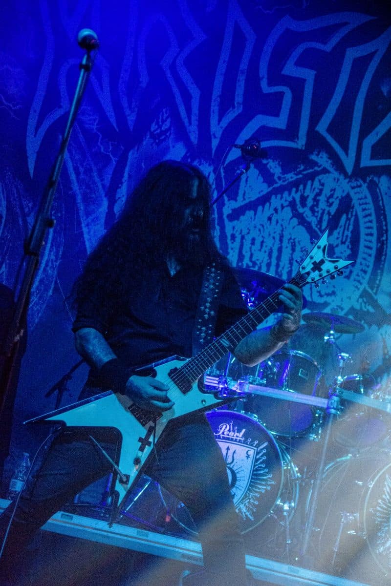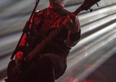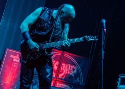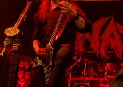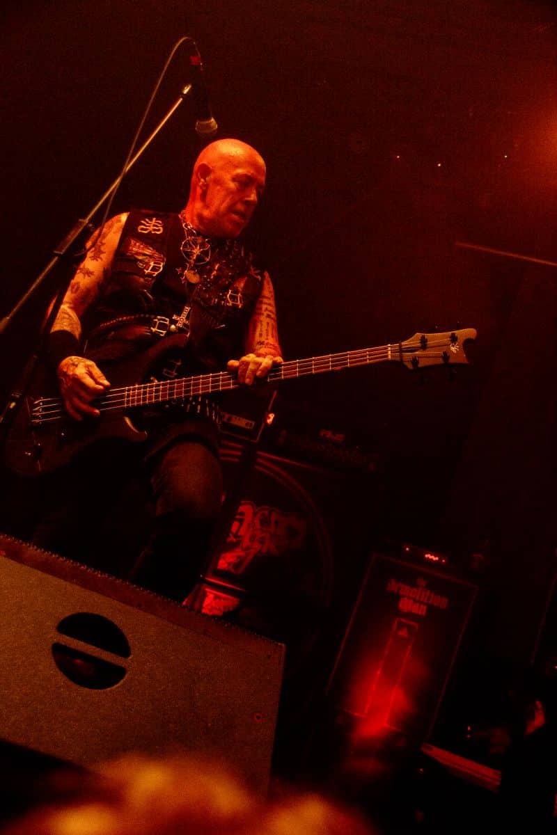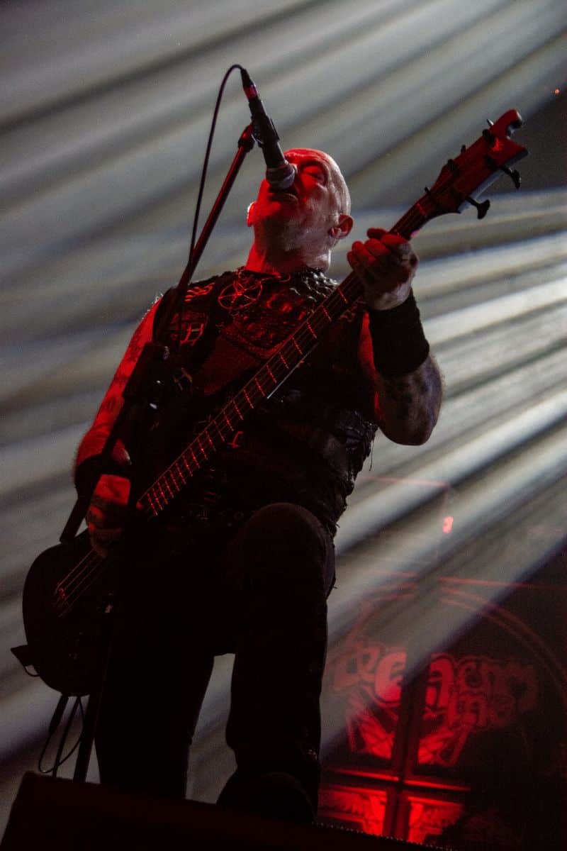 Fél szememet folyamatosan a merch-ön tartottam, miközben egy fekete molinót húztak fel a színpad elé – és megkezdődött a Venom Inc. fellépéséhez szükséges előkészületek sorozata (én meg a beszámoló hátralévő részében a Venom minden leszármazottjára azonos néven fogok hivatkozni, hacsak nem feltétlenül indokolt az elkülönítésük). Amíg az előkészületek zajlanak a színpadon, következzék a beszámoló azon mondata, amelyikhez azonnal elő is lehet a köveket készíteni, majd a (black metal-rajongó) újságírót azokkal szorgosan agyoncsapkodni: én nem szeretem a Venom-ot. (Ejnye-bejnye! – főszerk.) Tisztelem a munkásságukat, műfajteremtőként – de legrosszabb esetben is a műfaj meghatározó alakjaként – tekintek rájuk, de első körben nem nagyon tudok mit kezdeni a zenéjükkel hosszú évtizedek óta. Na, ez ügyben most érdemi változás következett be, bár az előjelek nem pontosan ebbe az irányba mutattak, ugyanis a Krisiun közönsége is lassacskán megfogyatkozott a Venom kezdésének pillanatára.