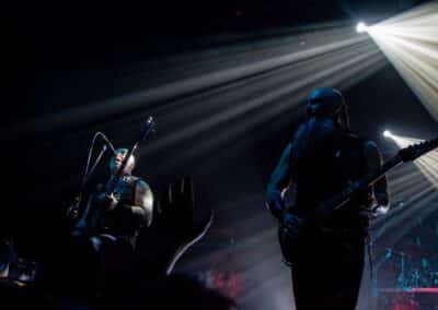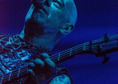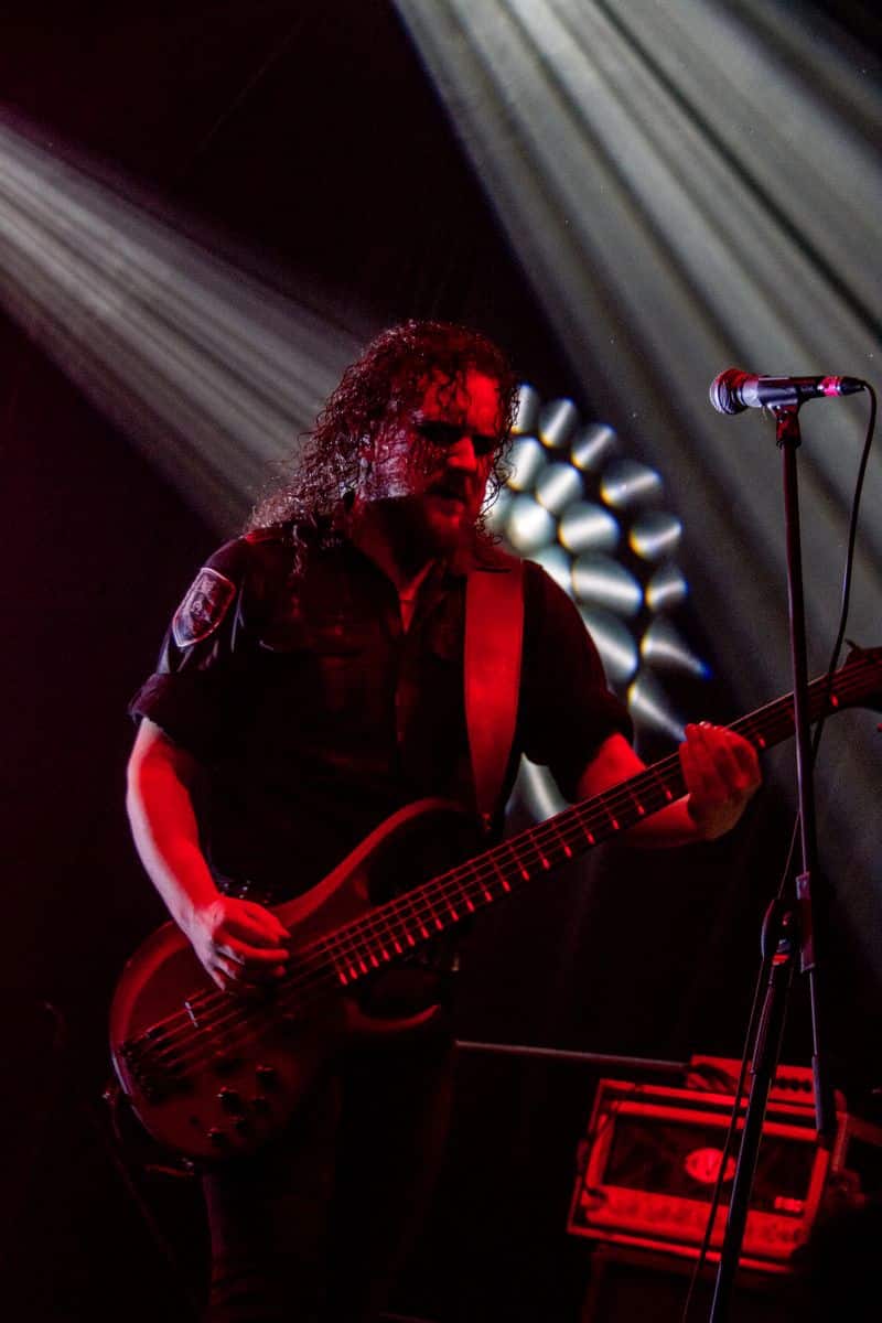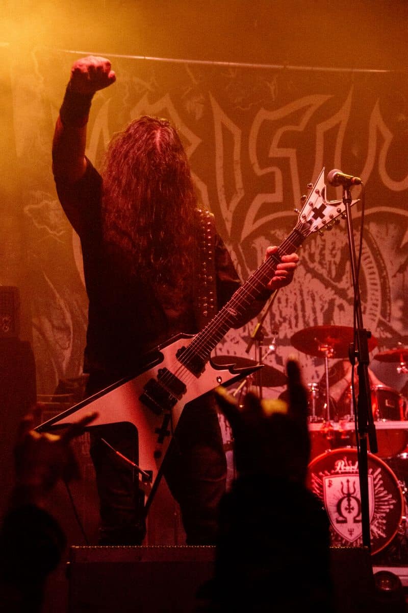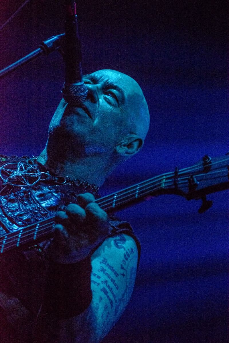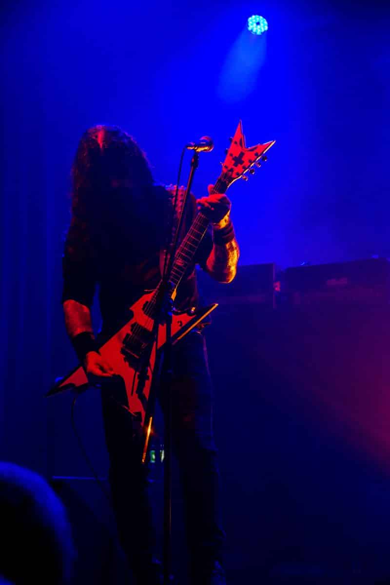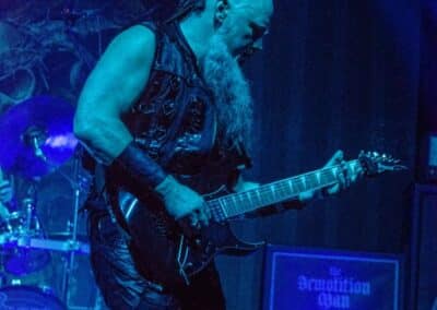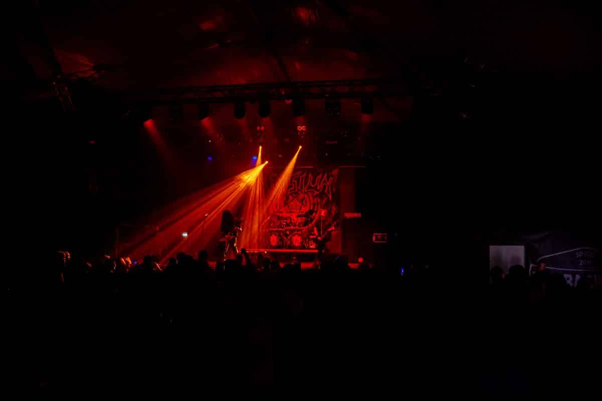 Fél szememet folyamatosan a merch-ön tartottam, miközben egy fekete molinót húztak fel a színpad elé – és megkezdődött a Venom Inc. fellépéséhez szükséges előkészületek sorozata (én meg a beszámoló hátralévő részében a Venom minden leszármazottjára azonos néven fogok hivatkozni, hacsak nem feltétlenül indokolt az elkülönítésük). Amíg az előkészületek zajlanak a színpadon, következzék a beszámoló azon mondata, amelyikhez azonnal elő is lehet a köveket készíteni, majd a (black metal-rajongó) újságírót azokkal szorgosan agyoncsapkodni: én nem szeretem a Venom-ot. (Ejnye-bejnye! – főszerk.) Tisztelem a munkásságukat, műfajteremtőként – de legrosszabb esetben is a műfaj meghatározó alakjaként – tekintek rájuk, de első körben nem nagyon tudok mit kezdeni a zenéjükkel hosszú évtizedek óta. Na, ez ügyben most érdemi változás következett be, bár az előjelek nem pontosan ebbe az irányba mutattak, ugyanis a Krisiun közönsége is lassacskán megfogyatkozott a Venom kezdésének pillanatára.