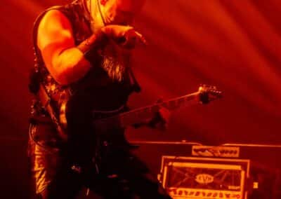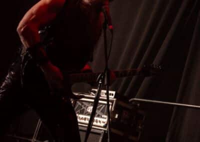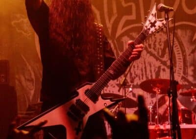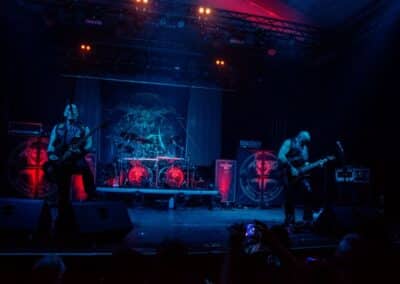Határozottan tetszett, amit és ahogy csináltak. A mostani fül számára már egészen biztosan nem hallatszik formabontónak ez a lassan 50 évvel ezelőtti zene – mert már megszoktuk ezeket az ötleteket és stílusjegyeket, ezeket hallgatjuk, ezeket tekintjük alapnak –, de a Venom zenéjét nem így kell hallgatni, hanem olyan füllel, amelyik számára ezek a zenei megoldásokat az újdonság erejével hatnak. Persze nem ők egyedüliként tették le a speed metal és a black metal alapjait, de nyugodtan kijelenthetjük, hogy ők is vastagon benne vannak abban a maroknyi zenekarban, amelyik annak idején a semmiből hozott létre valamit – és miután ez a valami létrejött, innentől már számtalan zenekar, imádott műfajunk kedvencei ezekre az alapokra építkeznek, és ezt a zenei eszköztárat használják. Ma – a közismert albumcím miatt – a black metal megalapozóinak tartjuk őket, de a helyzet ennél bonyolultabb, hiszen sok, ma már külön irányzatként létező műfaj stílusjegyeit ötvöztik zenéjükben. Miközben a dob már szinte teljesen a mai extrem metal vagy black metal kísérete volt, addig a zenéből a 70-es és 80-as évek rockzenéjét is tisztán ki lehetett hallani a heavy metal alapok mellett. Ahogy hallgattam a dalaikat, nem tudtam szabadulni attól a képtől, ahogy elképzeltem magamnak az első komolyabb Venom-koncertek egyikét; egészen elképesztő lehetett az a hatás, amit ez a teljesen forradalmi zene jelentett, és fontosságában minden bizonnyal a Beatles megjelenéséhez mérhető ez az esemény. Lassan 50 év telt el a Venom megalapítása óta, de ezek a zenék még mindig tudnak valamit mondani, és zenetörténeti fontosságuk mellett az élvezeti értékük és megmaradt – akárcsak a klasszikus zene esetében. Haydn, Mozart vagy Beethoven az évszázadok próbáját állták ki, és így maradtak fent a szűrőn, a Venom pedig egyelőre csak szűk 50 év távlatából mérettetett meg, de egyelőre megállja a helyét. Fantasztikus volt látni azt a folyamatot, amelynek során ezek a dalok megszületnek: Beleth (Curran Murphy) ujjai közül csak úgy folytak ki a riff-ek időnként bonyolultnál bonyolultabb szólókkal díszítve, miközben Tony Dolan kíméletlenül adta hozzá a kíséretet, ám az erőlködésnek vagy a műmájerkodásnak a legcsekélyebb nyomát sem lehetett rajtuk látni – és azzal együtt, hogy nem vagyok a Venom rajongója, minden tiszteletemet kivívták a fiúk. Aztán eltelt nagyjából másfél óra, természetesen elhangzott a Dal, Amiért Mindenki Jött, így ezt az eseményt innentől dramaturgiailag már nem lehetett hova fokozni (There’s Only Black, War, Come to Me, Bloodlust, Blackened Are the Priests, Carnivorous, Parasite, Ave Satanas, Inferno, Cursed, Metal We Bleed, Live Like an Angel (Die Like a Devil), Infinitum, Time to Die, Poison, Rip Ride, Prime Evil, Black Metal, Countess Bathory, In League With Satan).