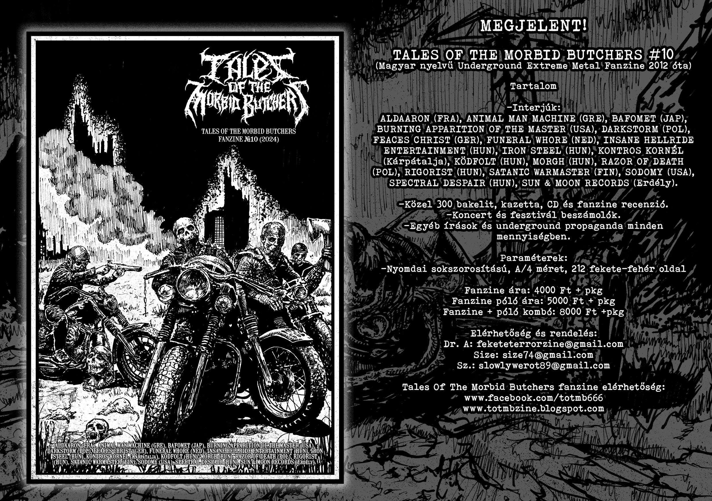 És akkor pár szó az ünnepeltről. A tizedik Tales Of The Morbid Butchers, mint korábban is egy nagyon tömény 212 oldalas nyomtatott újság formájában jelenik meg. A következő bandák, kiadók, underground aktivisták lettek kifaggatva: ALDAARON (FRA), ANIMAL MAN MACHINE (GRE), BAFOMET (JAP), BURNING APPARITION OF THE MASTER (USA), DARKSTORM (POL), FEACES CHRIST (GER), FUNERAL WHORE (NED), INSANE HELLRIDE ENTERTAINMENT (HUN), IRON STEEL (HUN), KONTROS KORNÉL/CASTRUM/ENCOMIUM FANZINE/HULLA/UNFOCUSED (Kárpátalja), KÖDFOLT (HUN), MORGH (HUN), RAZOR OF DEATH (POL), RIGORIST (HUN), SATANIC WARMASTER (FIN), SODOMY (USA), SPECTRAL DESPAIR (HUN), SUN & MOON RECORDS (Erdély). Az interjúk mellett közel 300 recenzió és jó pár koncert és fesztivál beszámoló is helyet kapott. Továbbá egy 25 oldalas írás is még színesíti a fanzine tartalmát, amit majd akkor tudtok meg, hogy mi az, ha megveszitek a lapot. A frontgrafikát továbbra is ANVIL KVLT készítette.”
