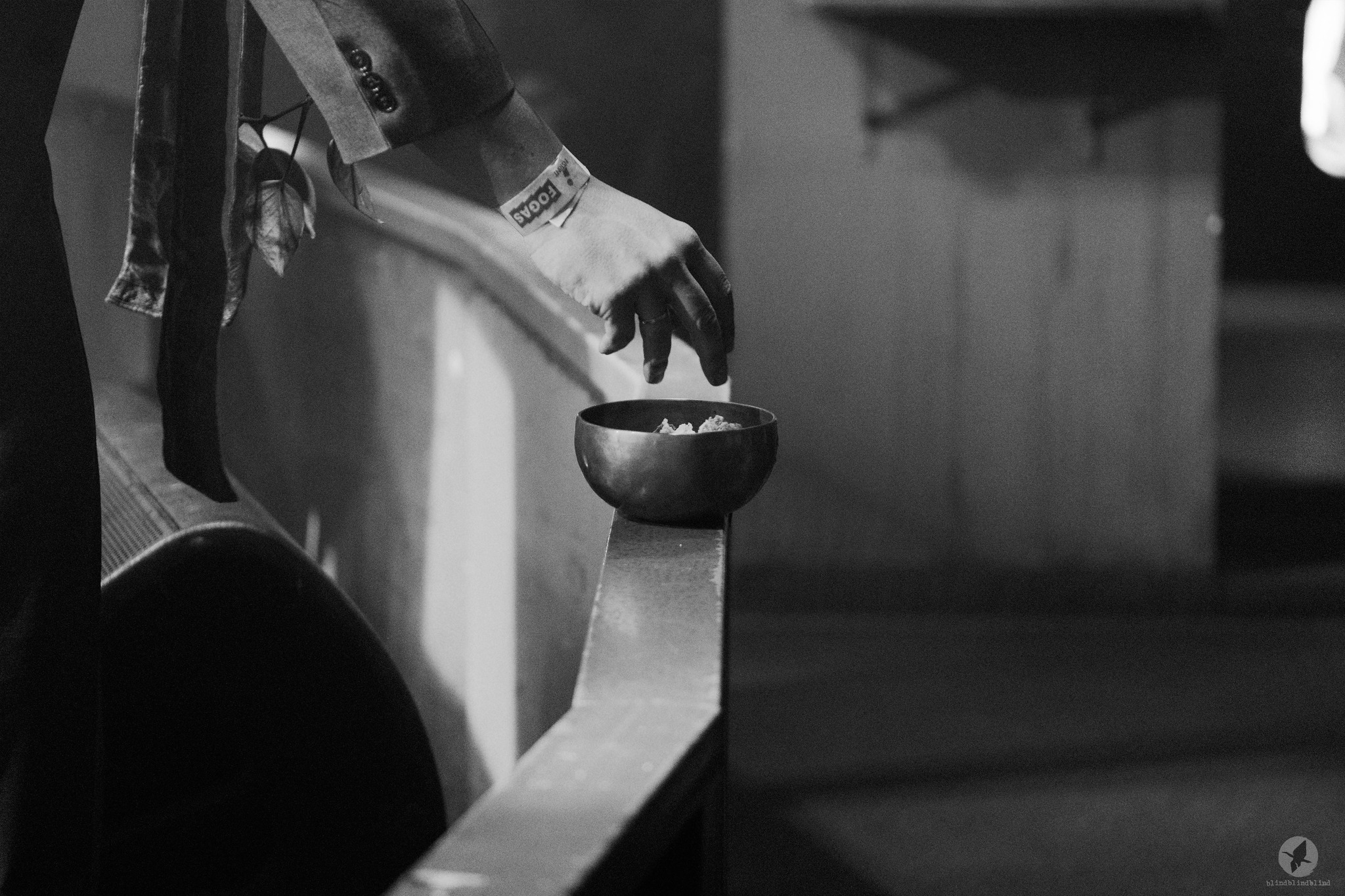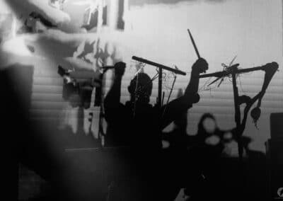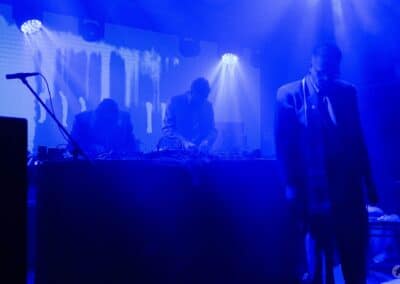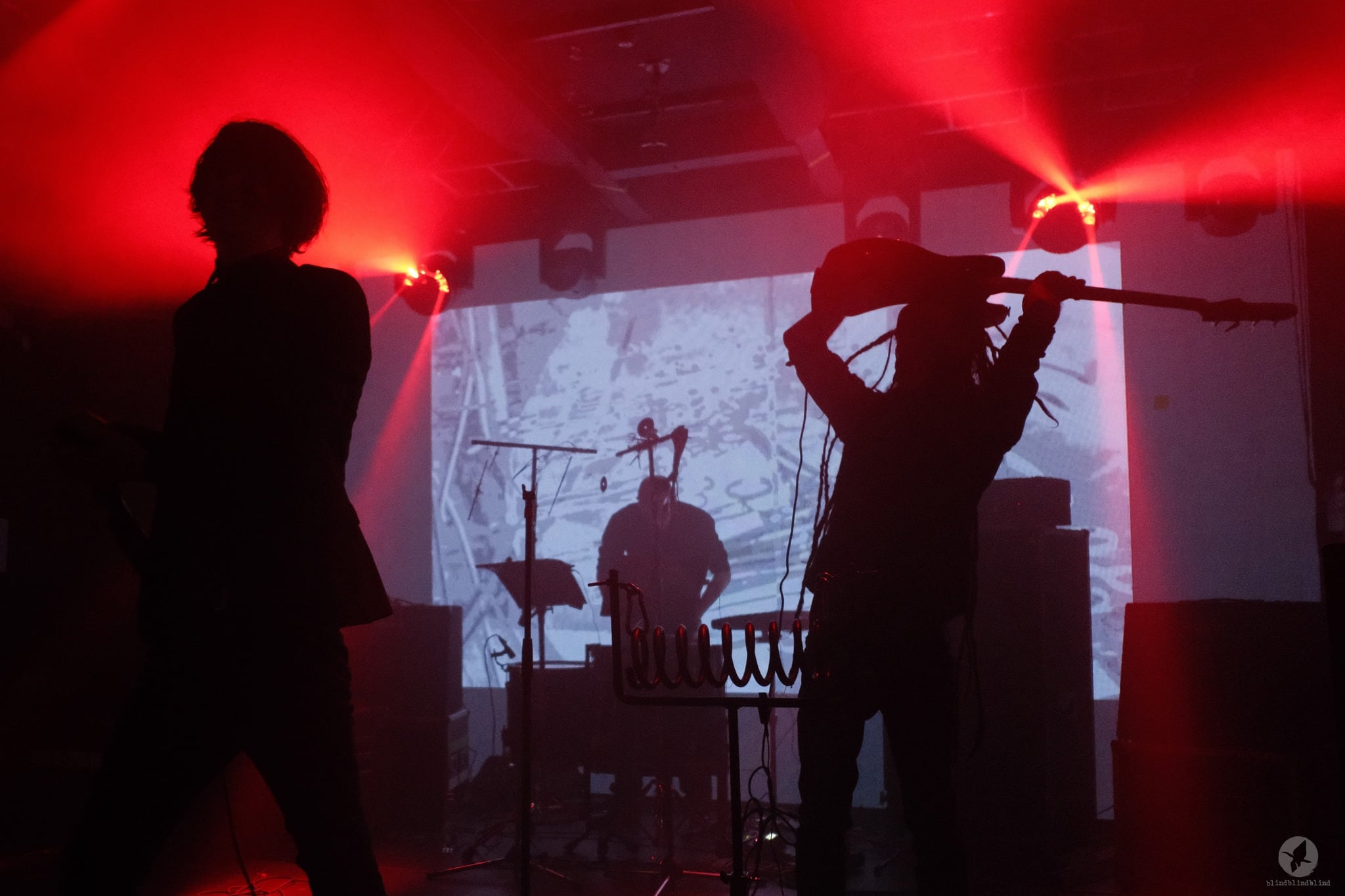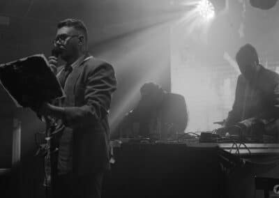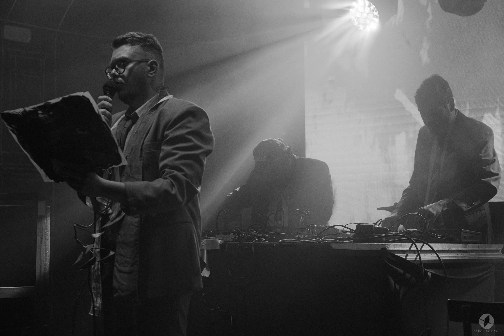 A dark ambient / spoken word / PE keverékével kacérkodik a DVX NXV triója. Fél órás performanszuk szintén ezekből az elemekből épült fel, melyben minimálisan teátrális megmozdulások is szerepet kaptak. Általában véve nehéz megítélni, mi számít jó hangzásnak egy ilyen produkció esetében, egyrészt szubjektív a dolog, másrészt mi a viszonyítási alap. Amit eddig hallottam a srácoktól bandcampen, az több mint meggyőző volt, a Puszta által festett apokaliptikus tájak intenzitása abszolút megnyerő volt számomra, az a fojtogató atmoszféra elég brutális tud lenni, amivel ez a kiadvány rendelkezik. Élőben viszont másabb volt mindez: a sound nyers és zajos (elvégre milyen legyen?!?) de sajnos nekem aránytalannak tűnt, az amúgy remek érzékkel és torzításban elhelyezett vokálok ledominálták a többi zajréteget / szintit / kütyüt, túlságosan az előtérbe lett tolva. Hogy most ez minek volt betudható pontosan, azt nem tudom, de kb. a set utolsó 1/3-adára sikerült ezt valamennyire stabilizálni, így elő-elő bukkantak azok a részek, amiért igenis magába-húzó kollektíva tud lenni a DVX NXV. A koncerten már meg lehetett vásárolni a Kulcsár – Boros – Mikolai trió friss Ouranopolis című kazettáját a blindblindblind kiadójától, mi pedig ezt hallhattuk most élő, egyenes adásban.