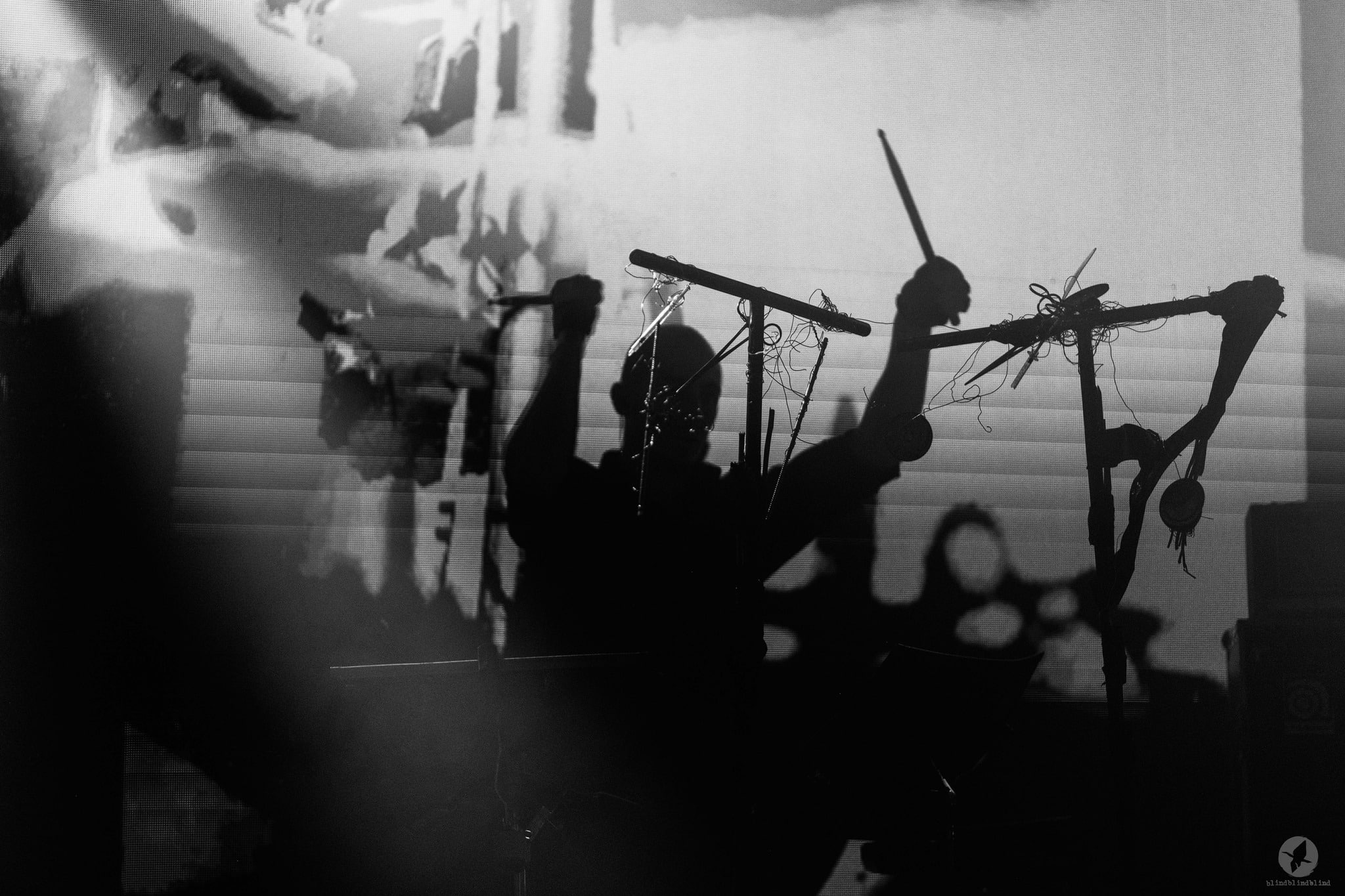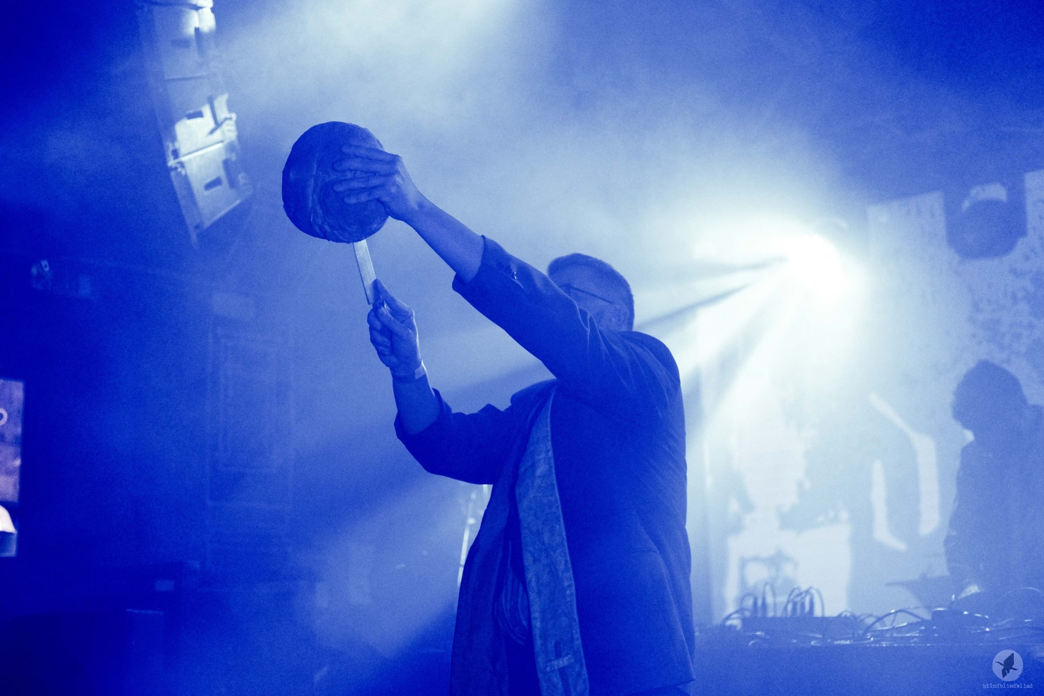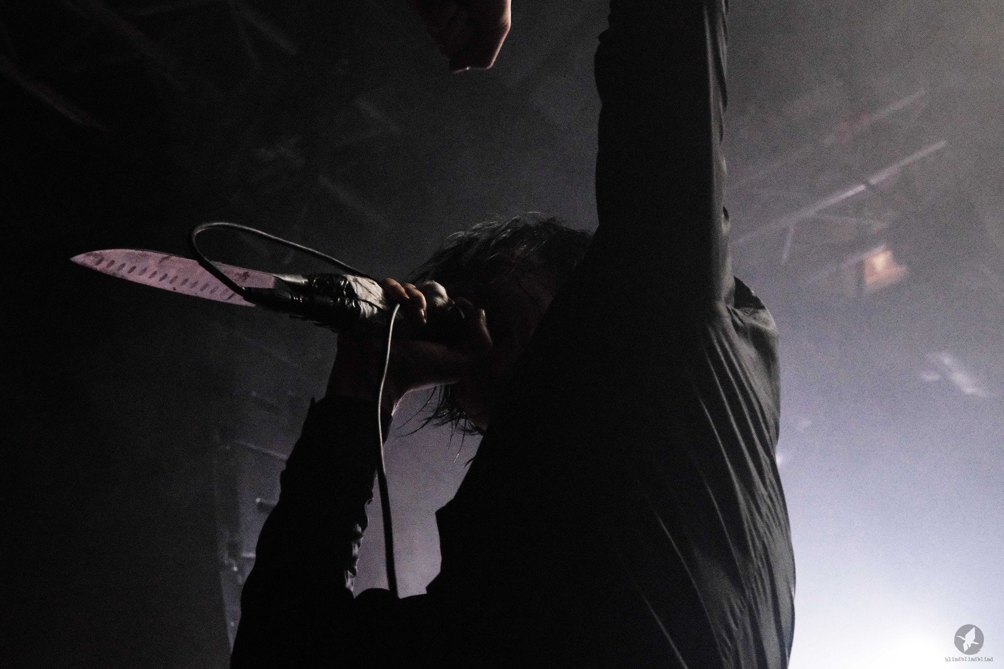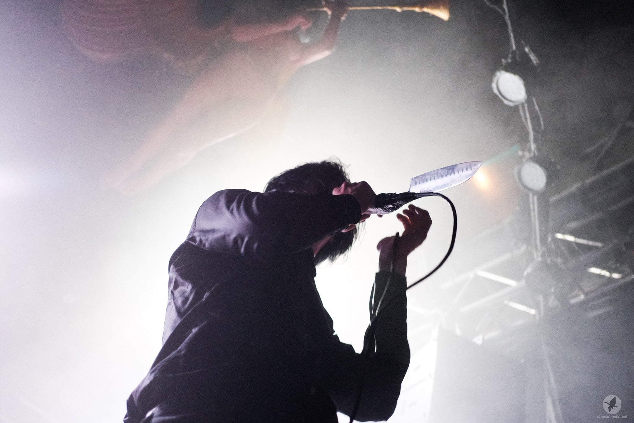 Végre teljes pompájában láthattam őket, hibátlan / remekül balanszált hangképet sikerült biztosítani nekik, le a kalappal a keverősük előtt. Hangerőben kicsit visszább lett fogva az egész, de ez nem vált a műsoruk rovására. Wade Black hozta a formáját, igazi pissed off stílóban nyomta, illik ehhez a rideg és barátságtalan miliőhöz. A mikrofonjához erősített hatalmas konyhakéssel hadonászva csak tovább fokozódott bennem a fentebb körülírt érzés – elgondolkodtató de ugyanakkor kétségbeejtően gyomorszorító is tud lenne az a gondolat, hogy csak elég, egy apró rossz mozdulat és … A Kollaps valahol egy szabályozott folyamat, irányított, tudatos. Nincsenek benne hibák vagyis lehetőségek hibára. Meg van szerkesztve, ezt a dalok felépítése és ügyes struktúrája is bizonyítja. A kiszámíthatatlanság, a szikra, hogyha kipattan valakinek a fejéből, hogy lángba borítson mindent, az Wade Black fejéből fog kipattani, ebben biztos vagyok. Több épített eszköz is szerves részét képezte a Kollaps hangképnek, vasak / spirálok, speciális fémlapok csapkodása – integrálódása során jött létre a jellegzetes és vaskos sound, amivel az ausztrálok operáltak. A set végén frontemberük Wade már-már tradícionális módon végig vitte az óramutató járásával ellentétes irányban ezt a különös fémállványt a nézőtér soraiban, ezzel pontot téve a fellépésükre.