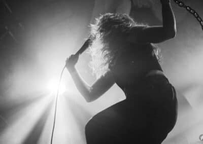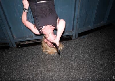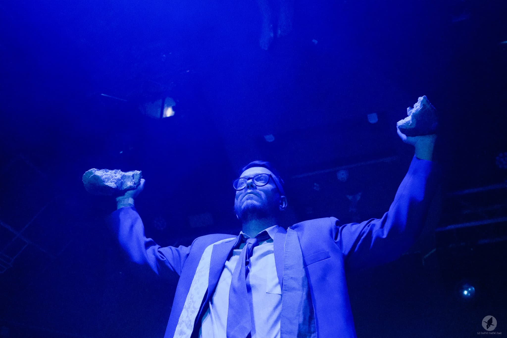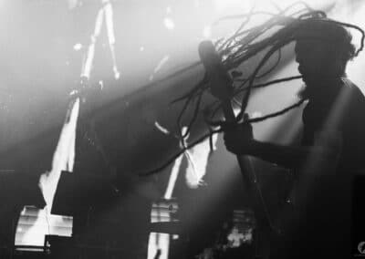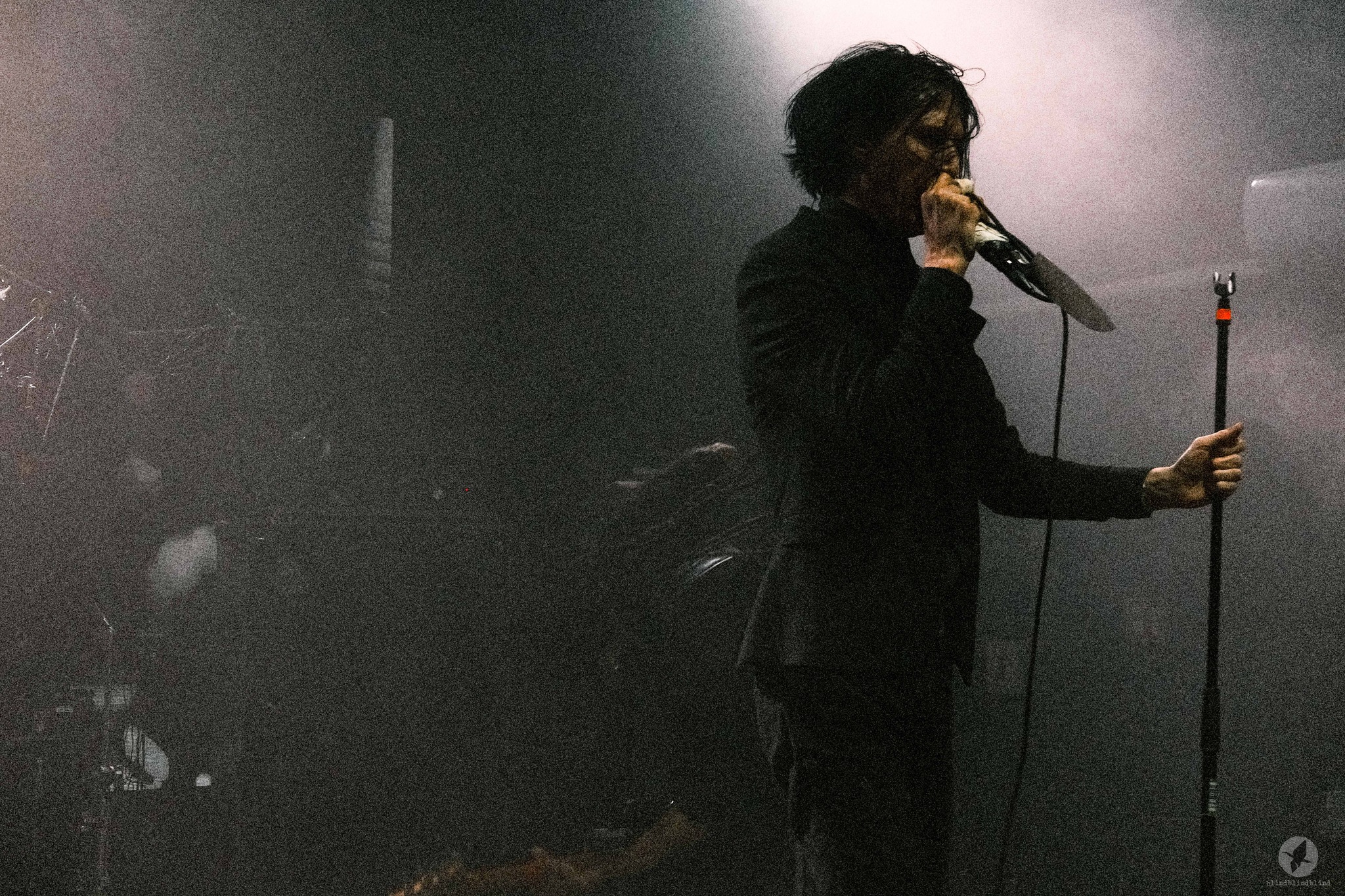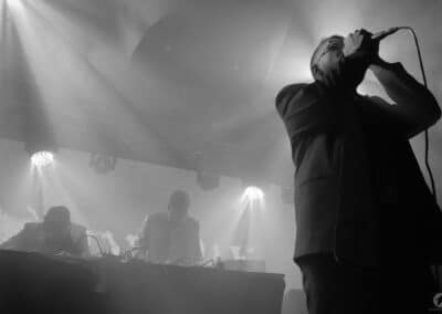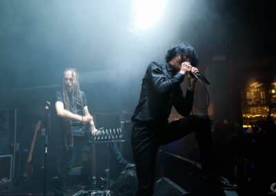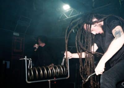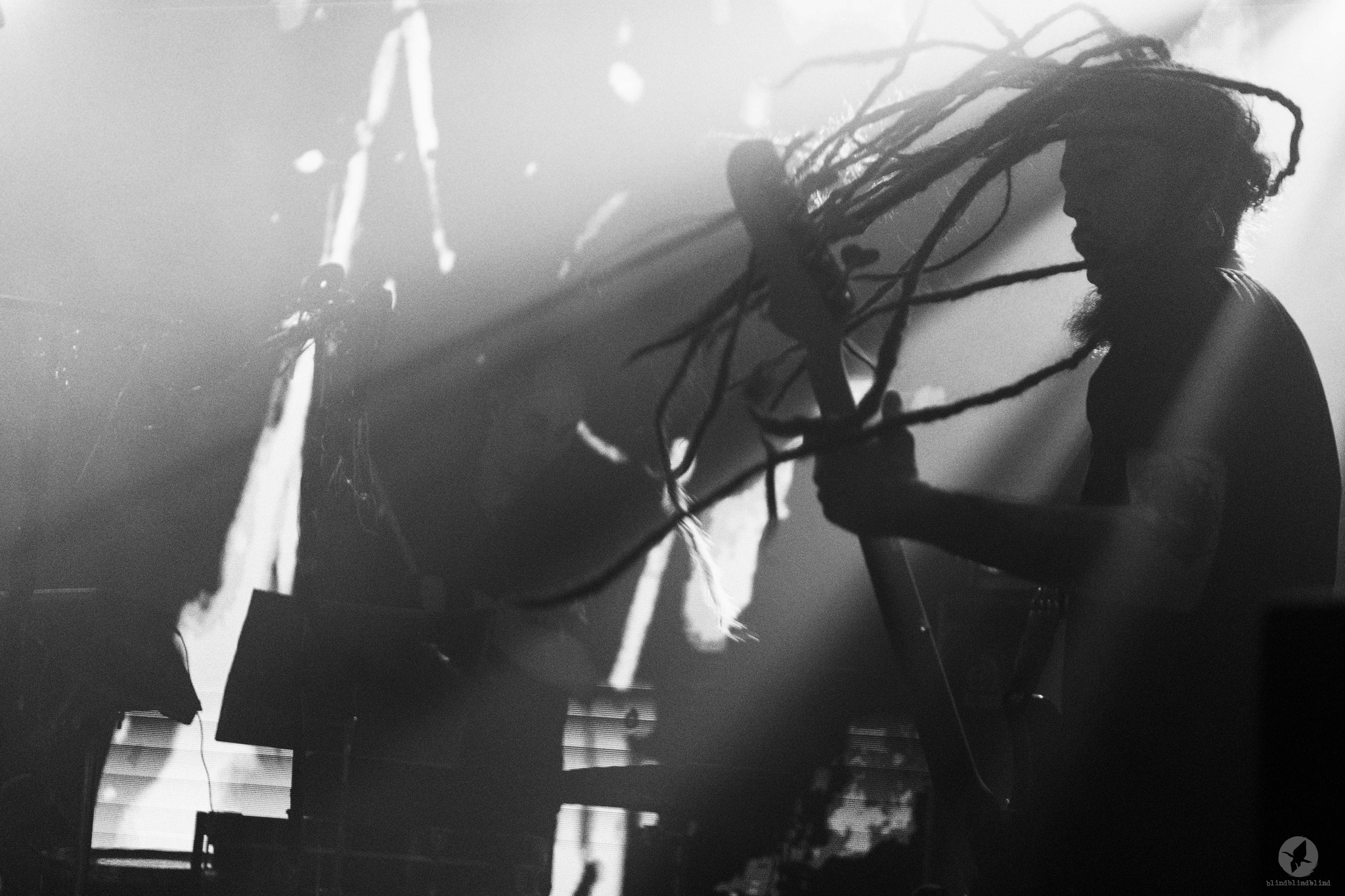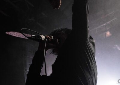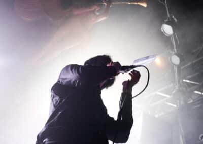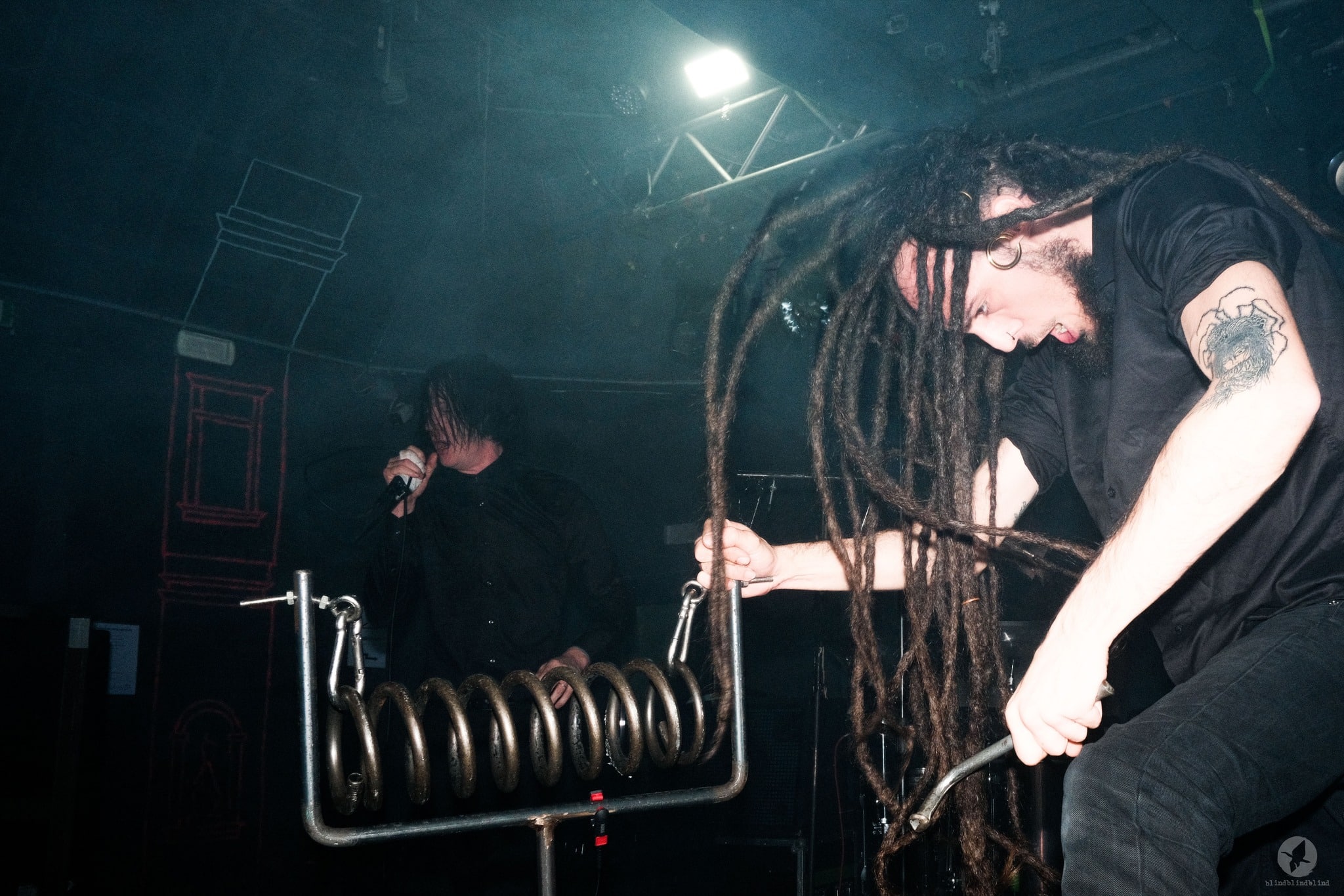 Végre teljes pompájában láthattam őket, hibátlan / remekül balanszált hangképet sikerült biztosítani nekik, le a kalappal a keverősük előtt. Hangerőben kicsit visszább lett fogva az egész, de ez nem vált a műsoruk rovására. Wade Black hozta a formáját, igazi pissed off stílóban nyomta, illik ehhez a rideg és barátságtalan miliőhöz. A mikrofonjához erősített hatalmas konyhakéssel hadonászva csak tovább fokozódott bennem a fentebb körülírt érzés – elgondolkodtató de ugyanakkor kétségbeejtően gyomorszorító is tud lenne az a gondolat, hogy csak elég, egy apró rossz mozdulat és … A Kollaps valahol egy szabályozott folyamat, irányított, tudatos. Nincsenek benne hibák vagyis lehetőségek hibára. Meg van szerkesztve, ezt a dalok felépítése és ügyes struktúrája is bizonyítja. A kiszámíthatatlanság, a szikra, hogyha kipattan valakinek a fejéből, hogy lángba borítson mindent, az Wade Black fejéből fog kipattani, ebben biztos vagyok. Több épített eszköz is szerves részét képezte a Kollaps hangképnek, vasak / spirálok, speciális fémlapok csapkodása – integrálódása során jött létre a jellegzetes és vaskos sound, amivel az ausztrálok operáltak. A set végén frontemberük Wade már-már tradícionális módon végig vitte az óramutató járásával ellentétes irányban ezt a különös fémállványt a nézőtér soraiban, ezzel pontot téve a fellépésükre.