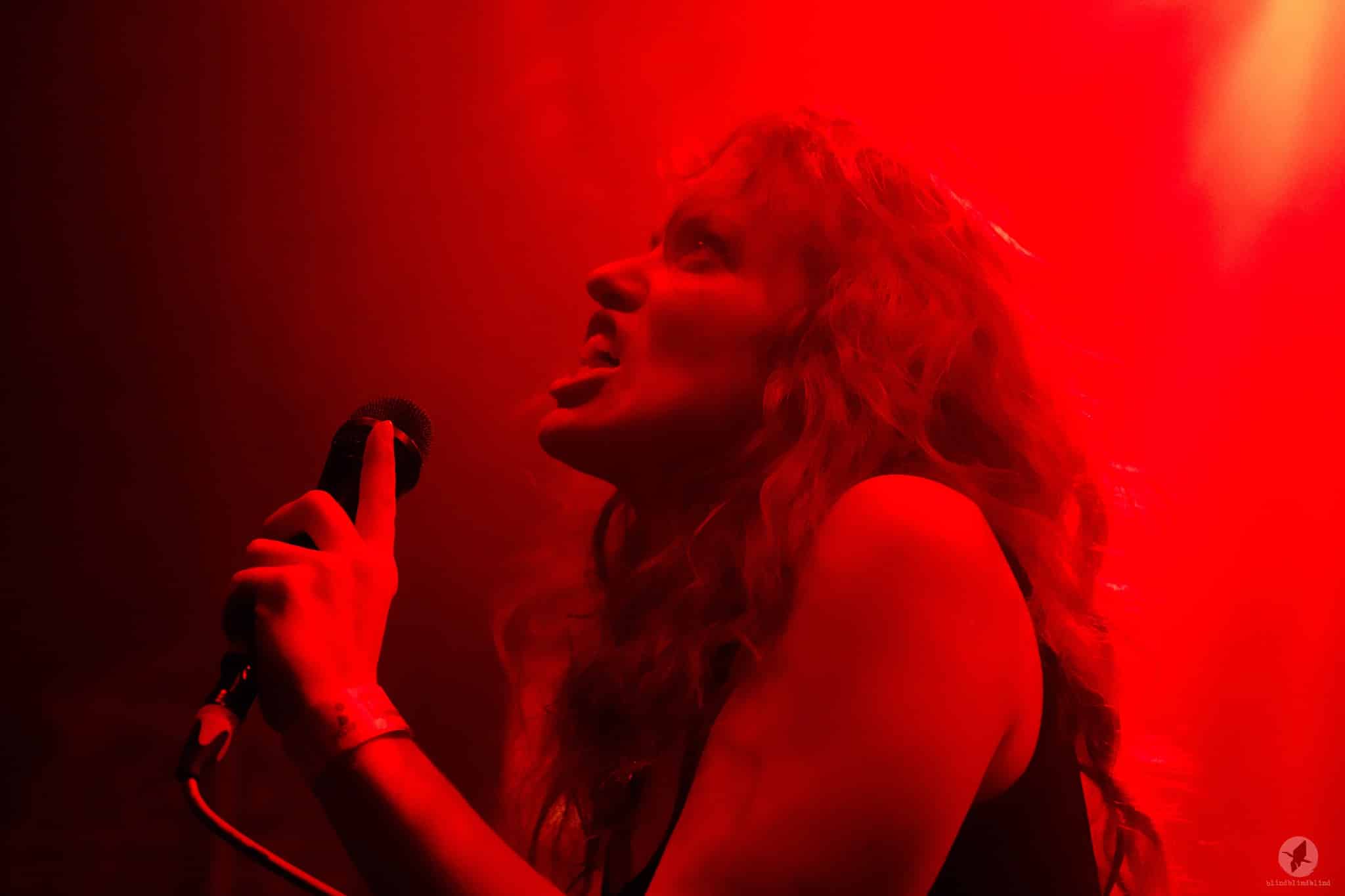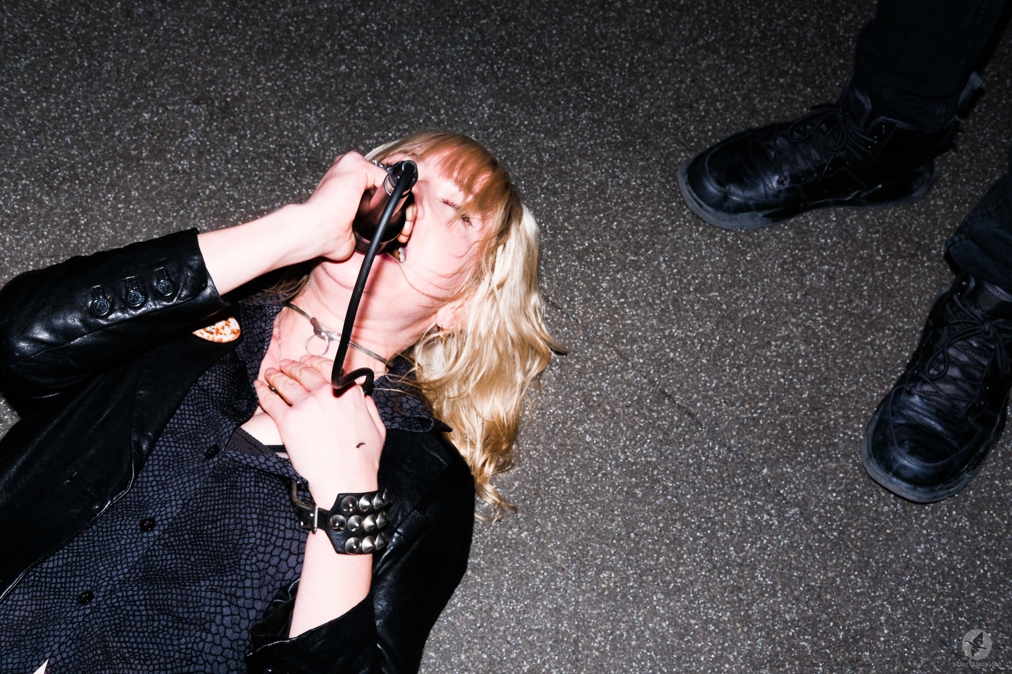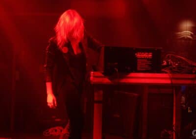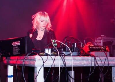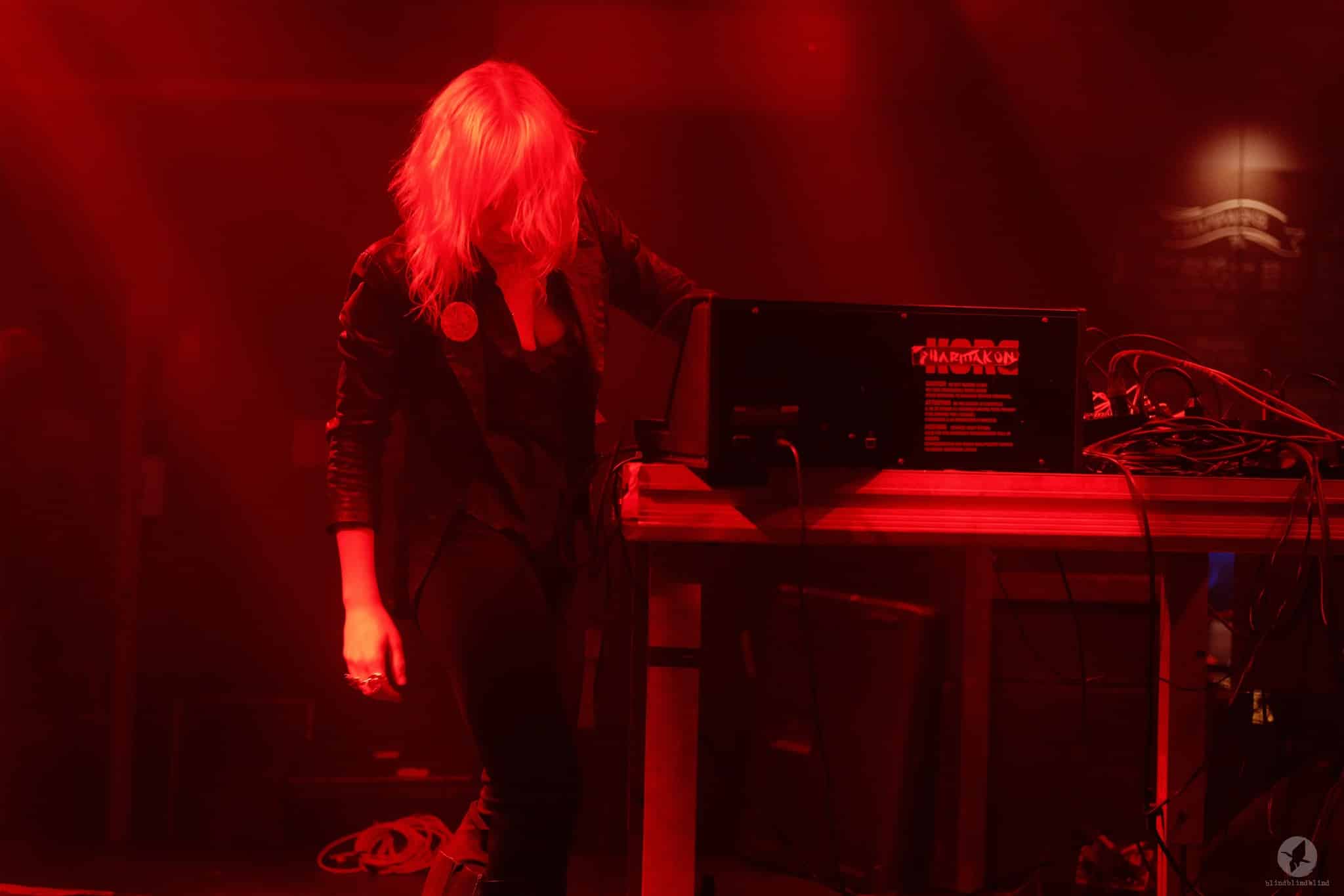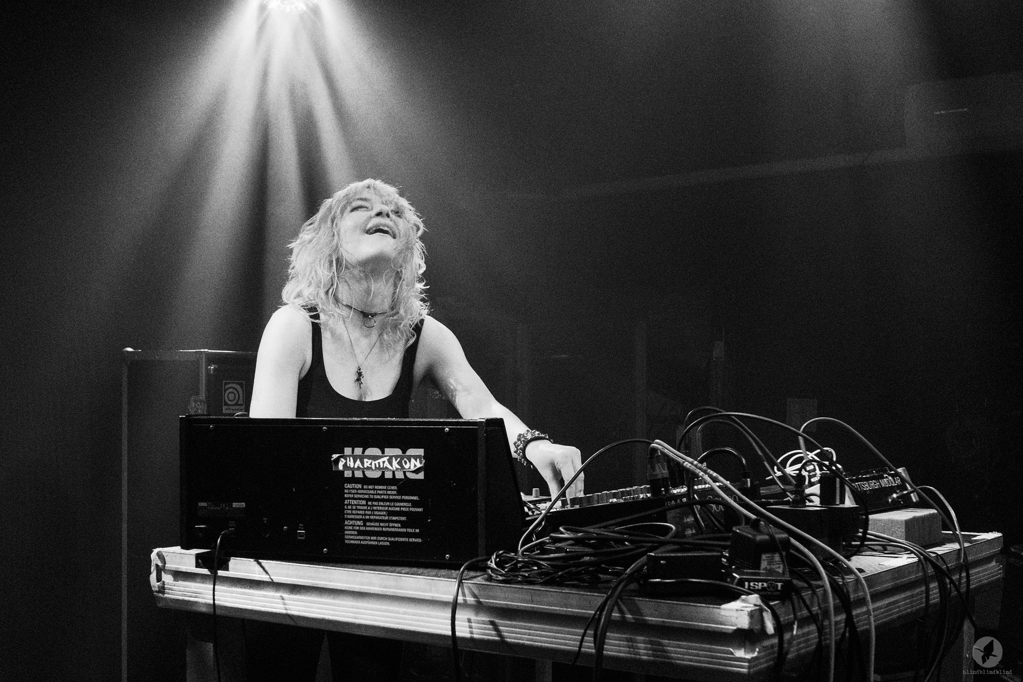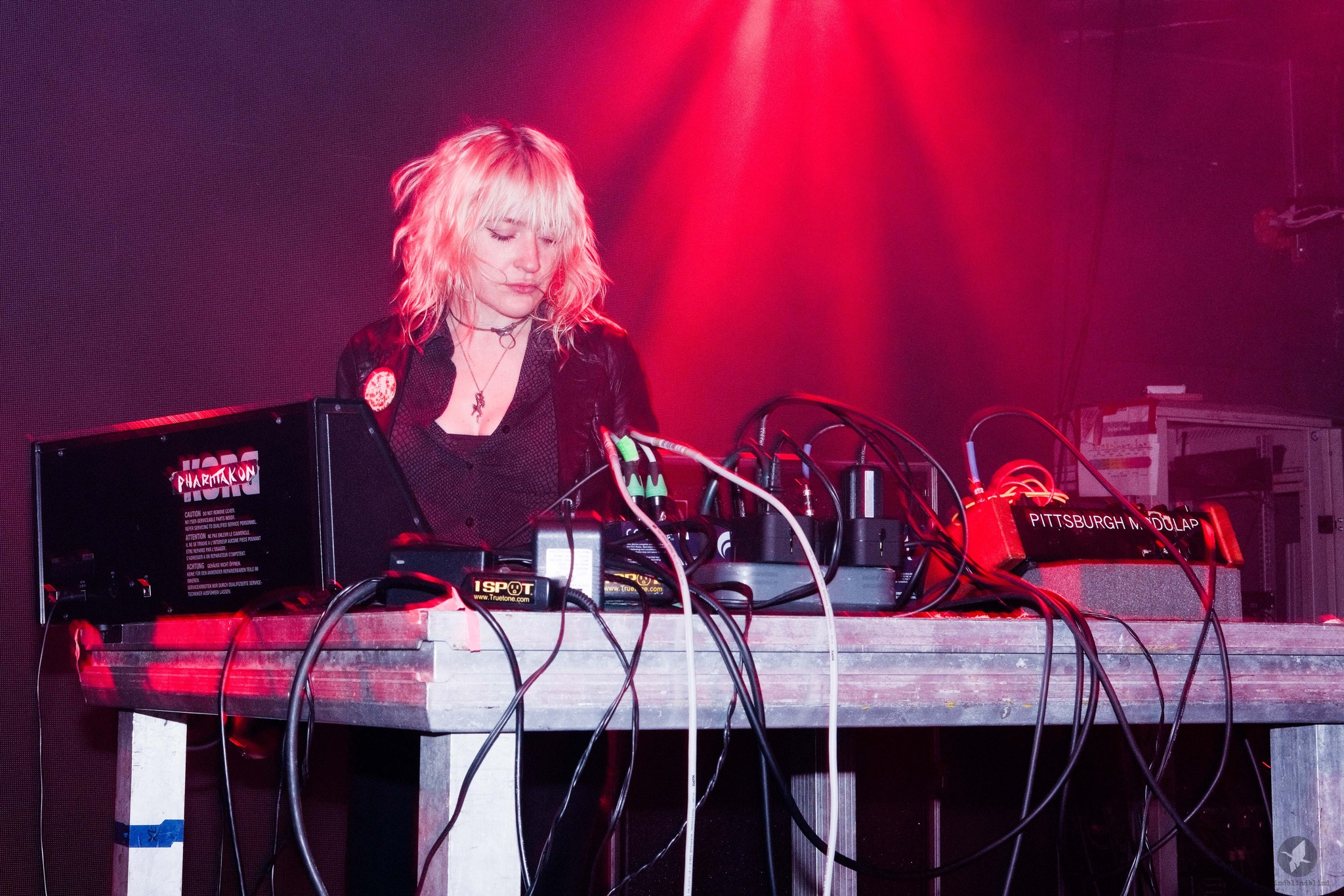 A művésznőhöz már volt szerencsém 2 évvel ezelőtt, akkor a komplexum Robot részében volt a koncert, most itt nagyobb teret / színpadot és kifinomultabb hangosítást kapott az egész. Hangerőben ő még inkább visszább lett véve, míg az elején az első kettő performer esetében full ajánlott volt a füldugó használata (üdv és köszi az Instant hangosának!) addig a Kollaps és a Pharmakon esetében már simán lehetett élvezni ezt “nyitott fülekkel” is. Nemrég jelent meg az ötödik nagylemez (melynek csodaszép méregzöld vinyl változatát meg is lehetett a helyszínen vásárolni) a Maggot Mass dalaira épült a műsor. A hangzásba nála sem tudtam belekötni, talán lehetett volna hangosabb, de minden élő volt. Aki látta már a Pharmakon-t koncerten, az tudja mire számíthat: most sem volt másképp, viszont ha lehet azt mondanom Margaret még intenzívebb / bátrabb és direktebb frontemberként ténykedett, önmagához képest is. Végtelen méteres mikrofonzsinorjával gond nélkül az aurádba sétált, körbetekert a kábellel, hajat kócolt vagy az arcodba üvöltött, de volt, hogy dedikált vinyl-t hajlított háttal, a keverőpultnál.