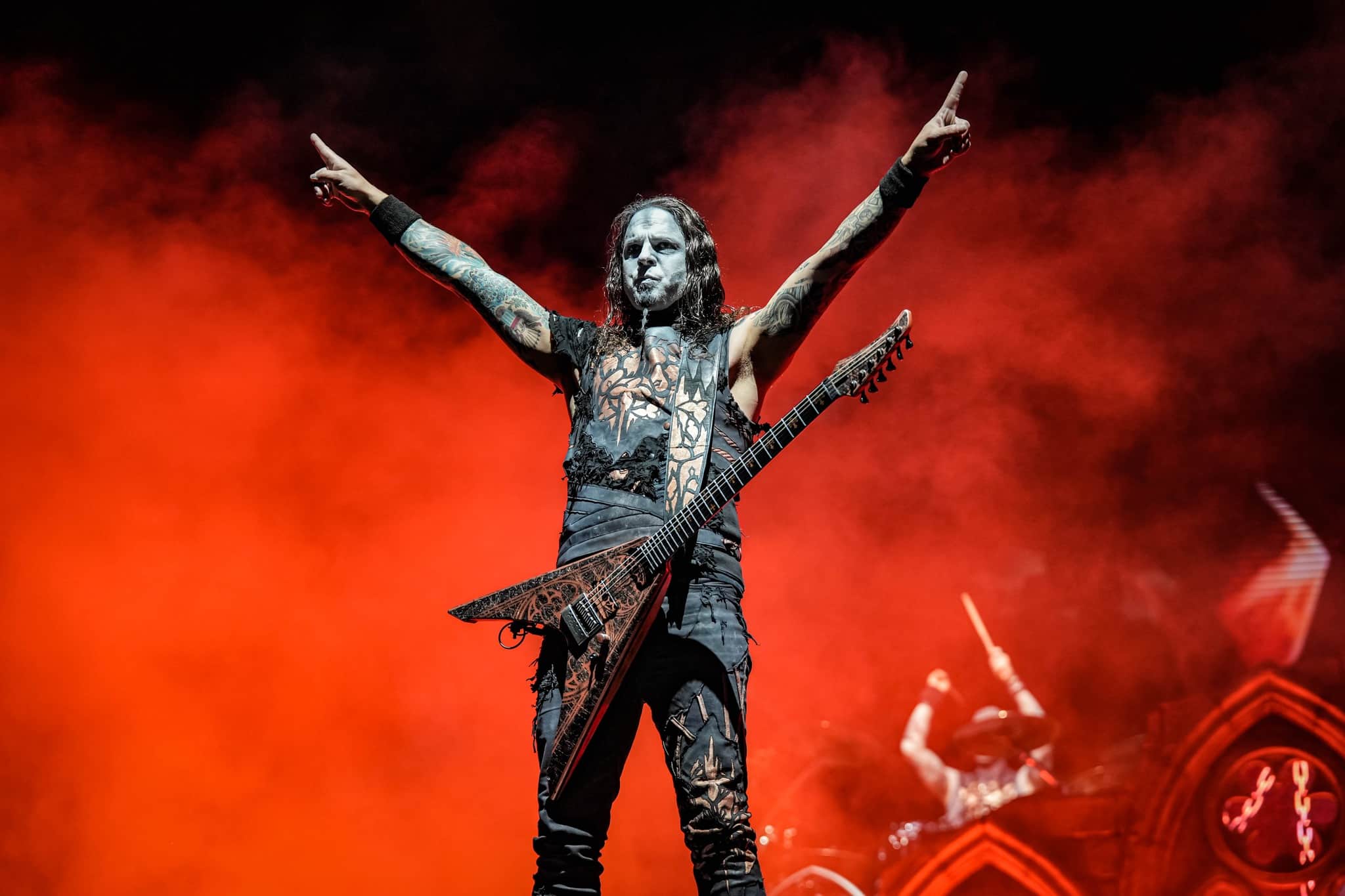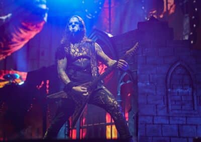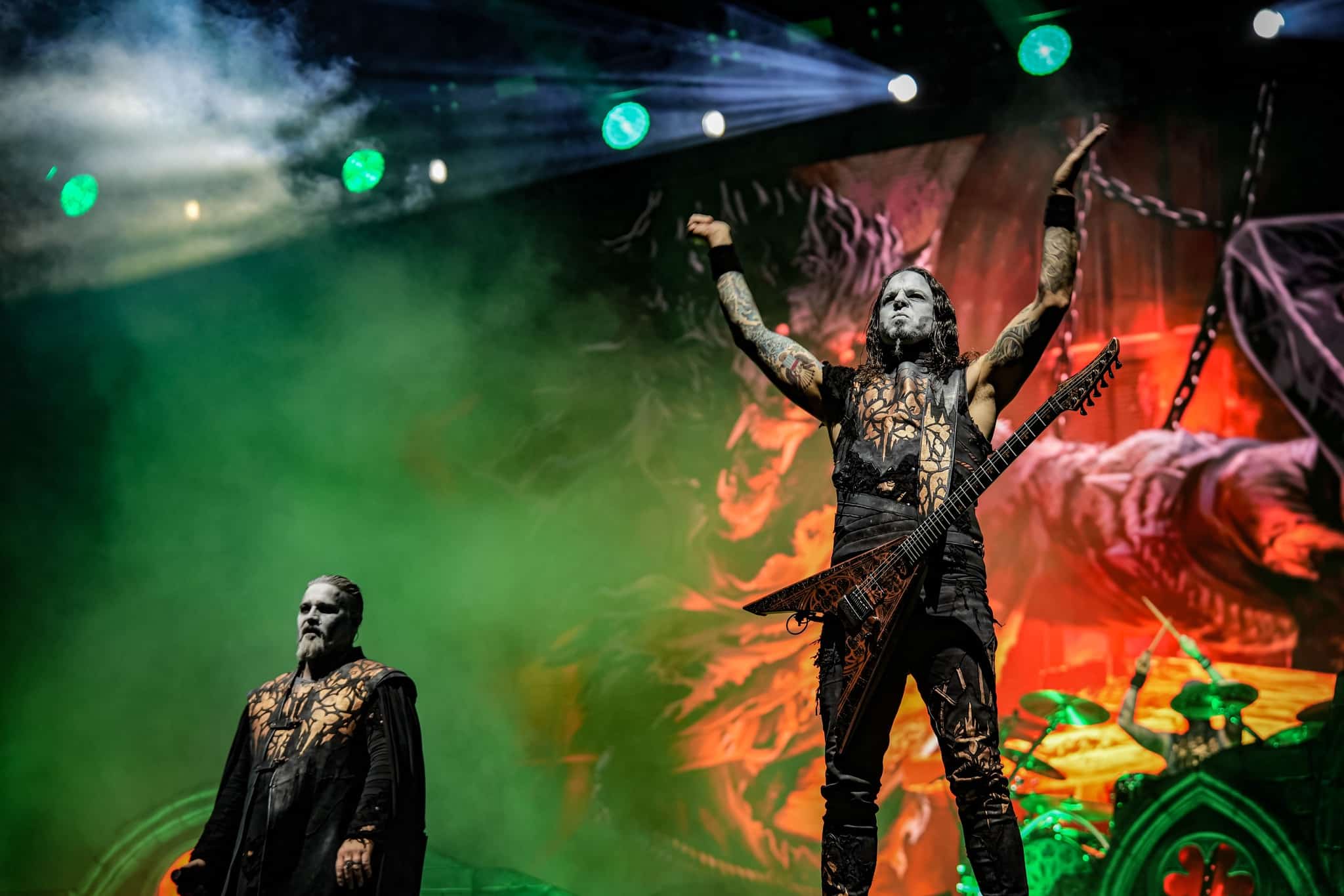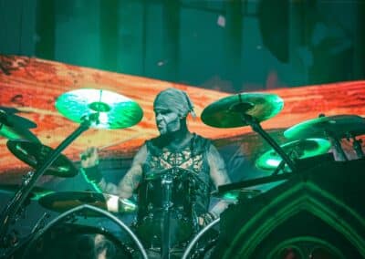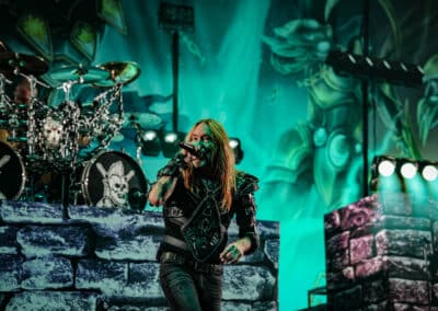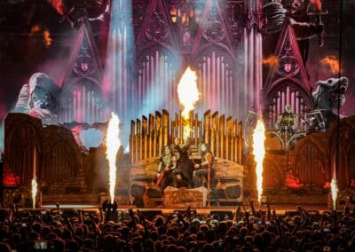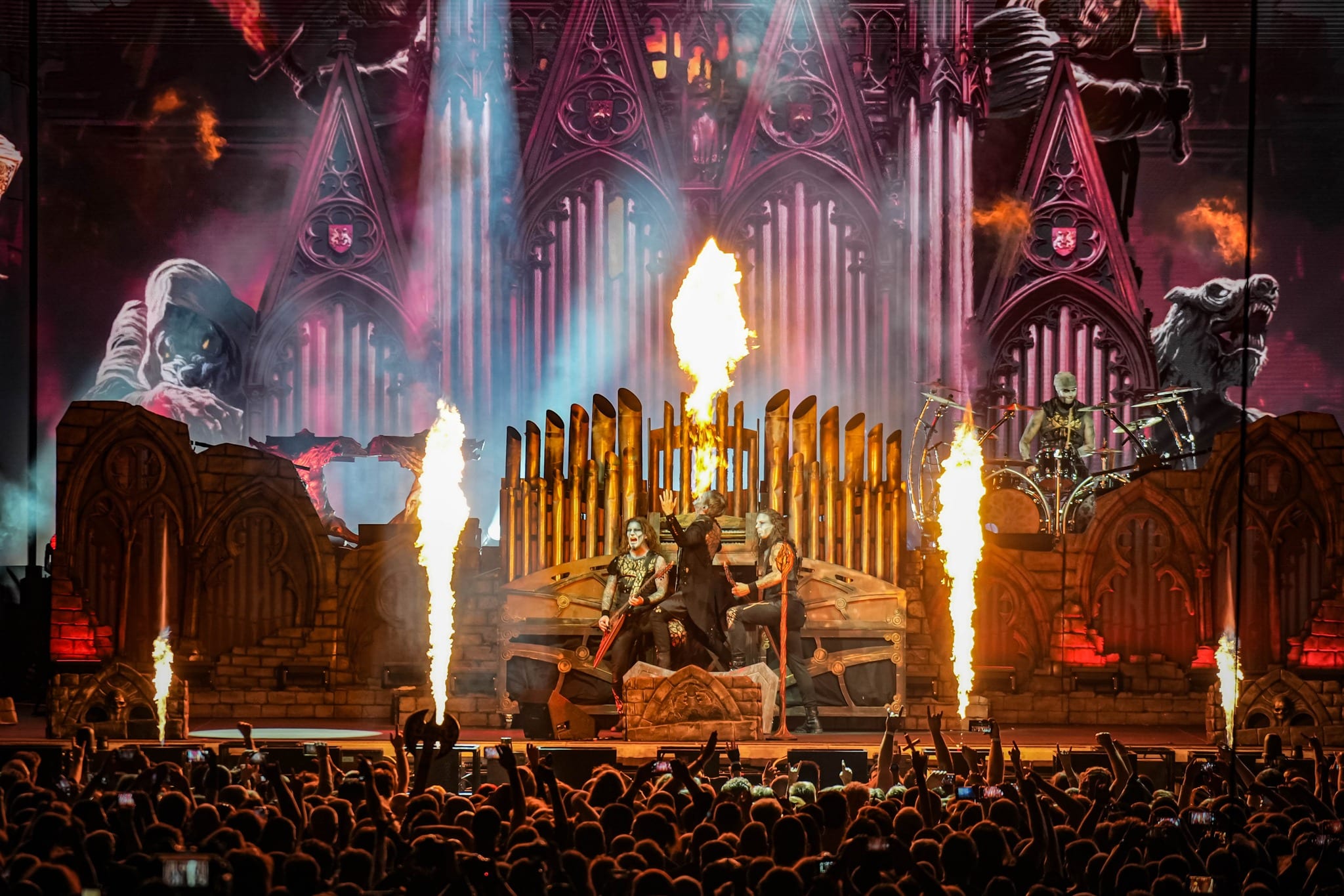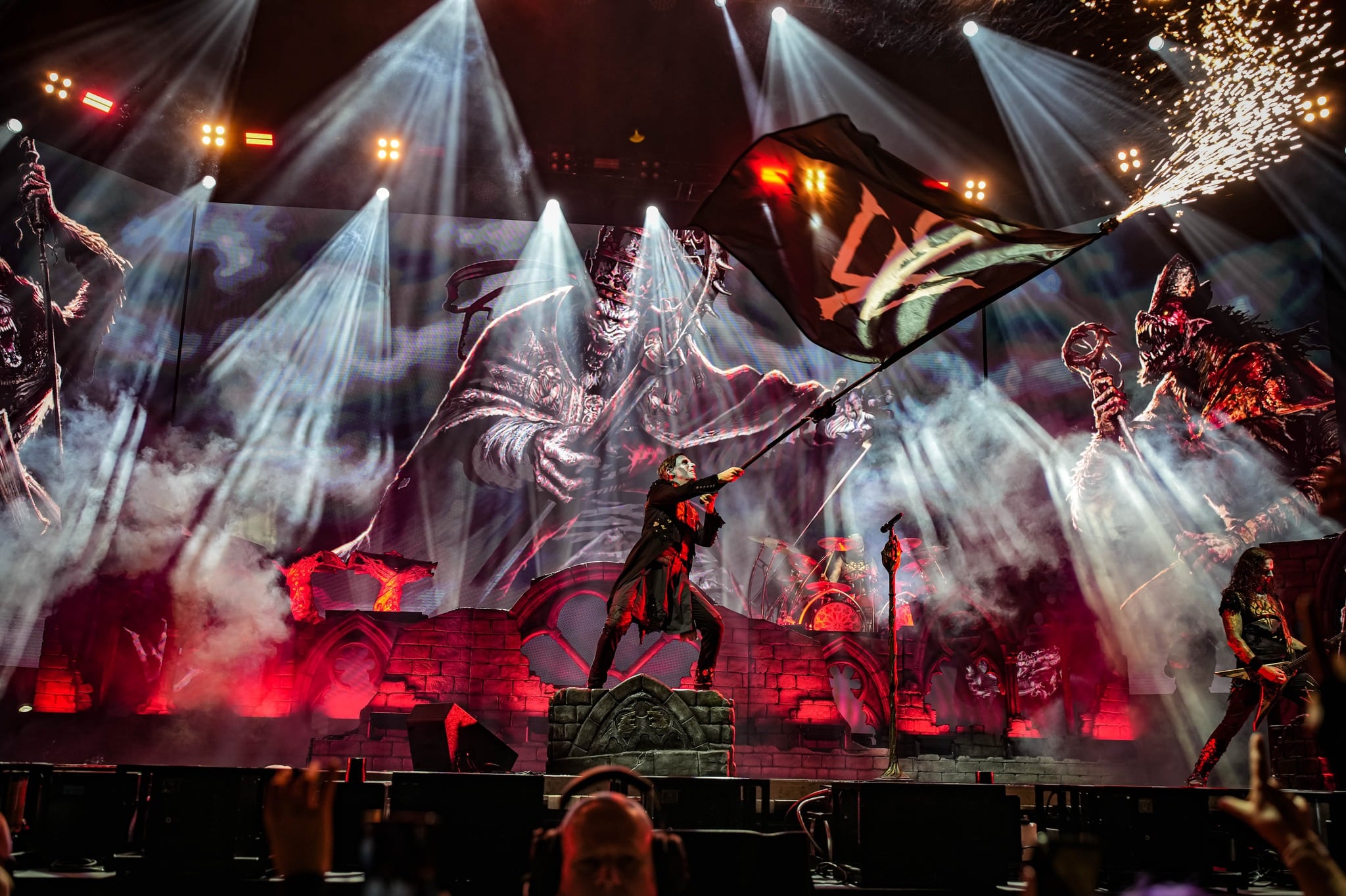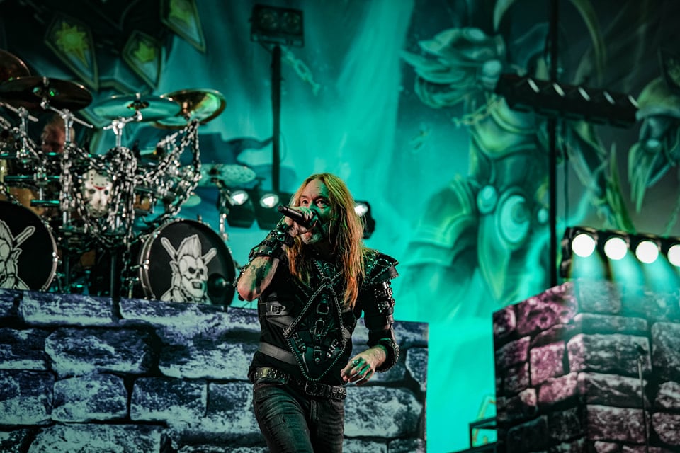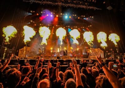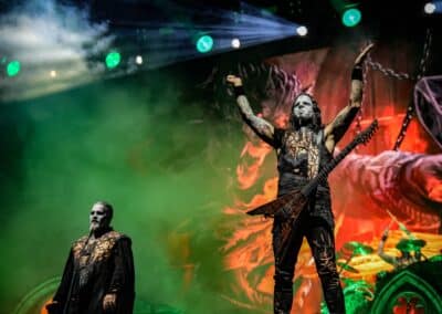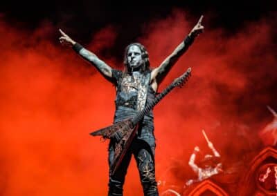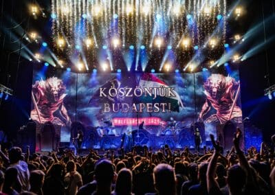 Pontos kezdés után, ahogy egyébként a másik két zenekar is, lehullott a függöny, és élénk tárult egy hatalmas templomot idéző színpadkép, régen nem látott méretű ledfallal a háttérben, amin folyamatosan animált, témába vágó képet kaptunk, természetesen nem kis mennyiségű tűzijáték és lángcsóva kíséretében. Nehéz leírni a látványt, inkább nézzétek végig a koncerten készült galériánkat, a képek ömagukért beszélnek. Aki látta a csapat pandémia alatt készült Monumental Mass kiadványát, ami az itthoni Raktár koncertek kicsit nagyobb volumenű megfelelője a Powerwolf esetében, annak nagyjából ugyanezt kell elképzelni, csak 3 dimenzióban és kicsit hangosabban. 16+3 számos setlist, két órás farkaskodás, eszméletlen hangulat. Nem maradt el a “most ketté választom a közönséget mint Mózes a tengert”, jobb és baloldali közönség énekeltetés sem. Kollégánk készített egy rövidke videót is, mely igyekszik összefoglalni ezt a fantasztikus élményt, amit leírni inehezen tudunk. A videót ITT ÉRITEK EL.
