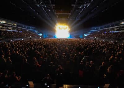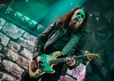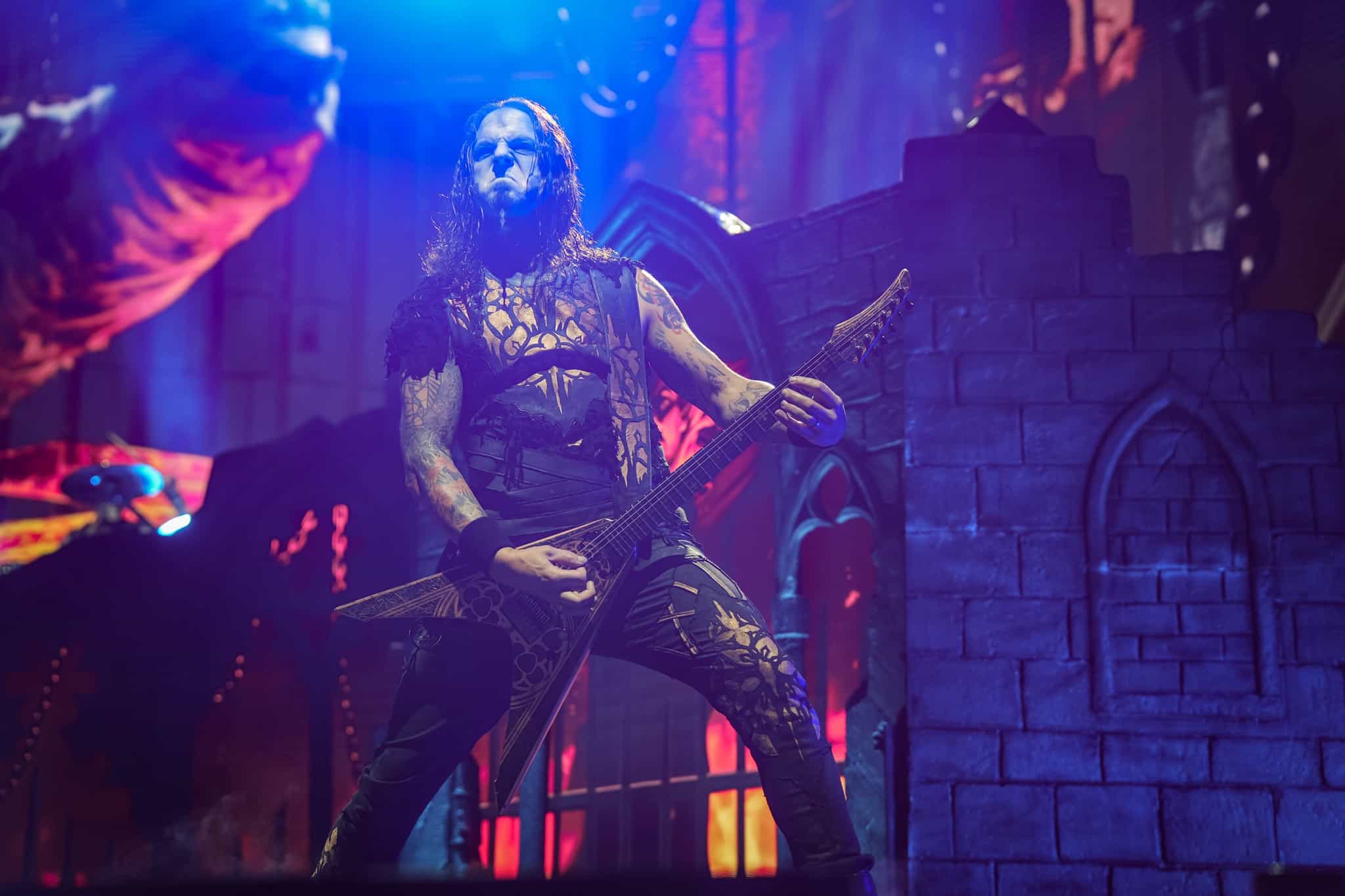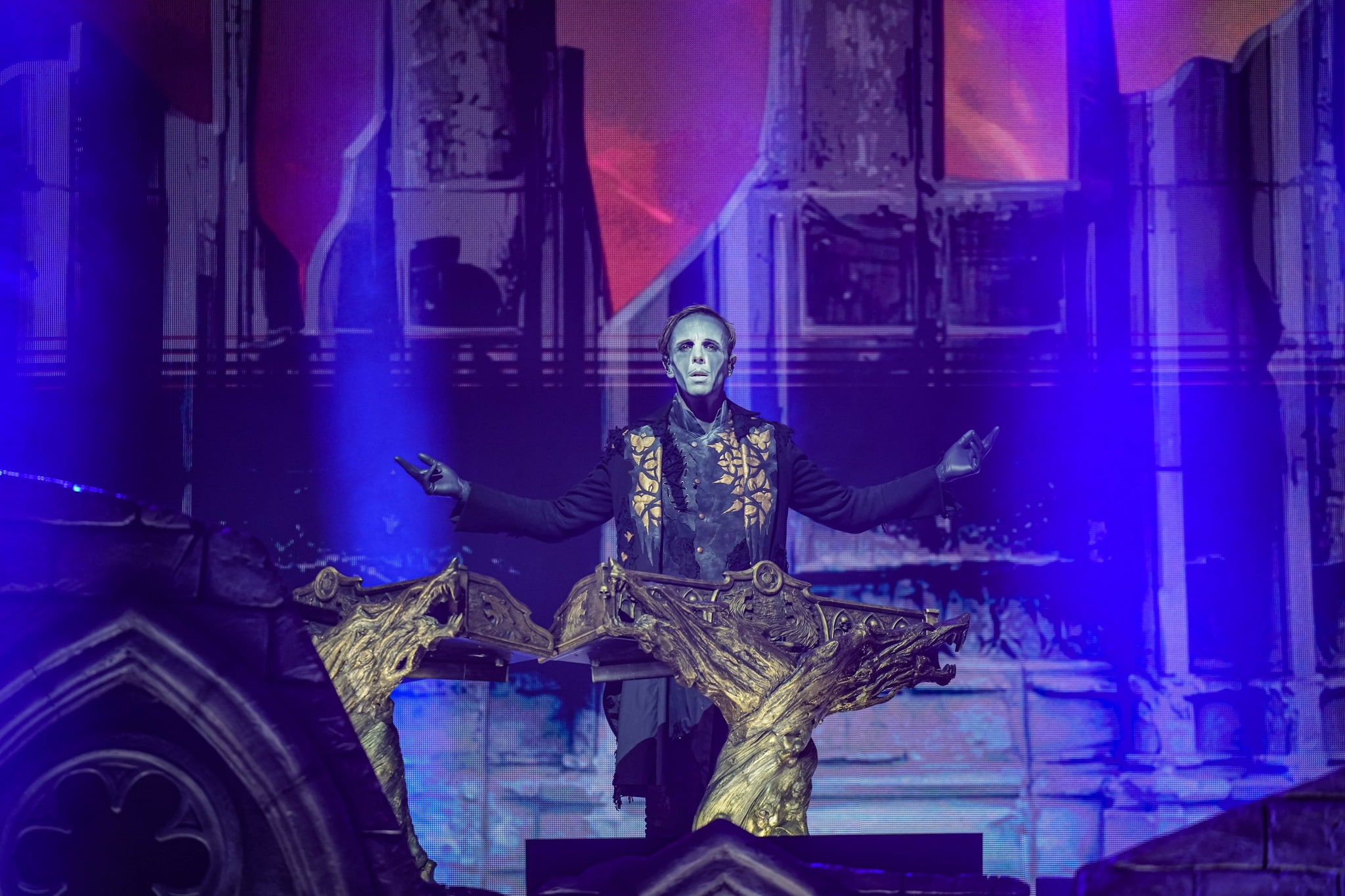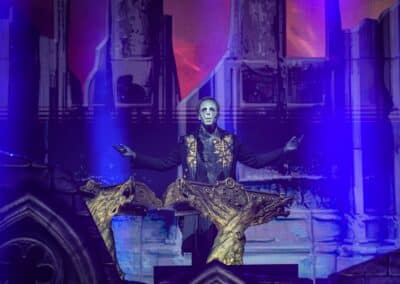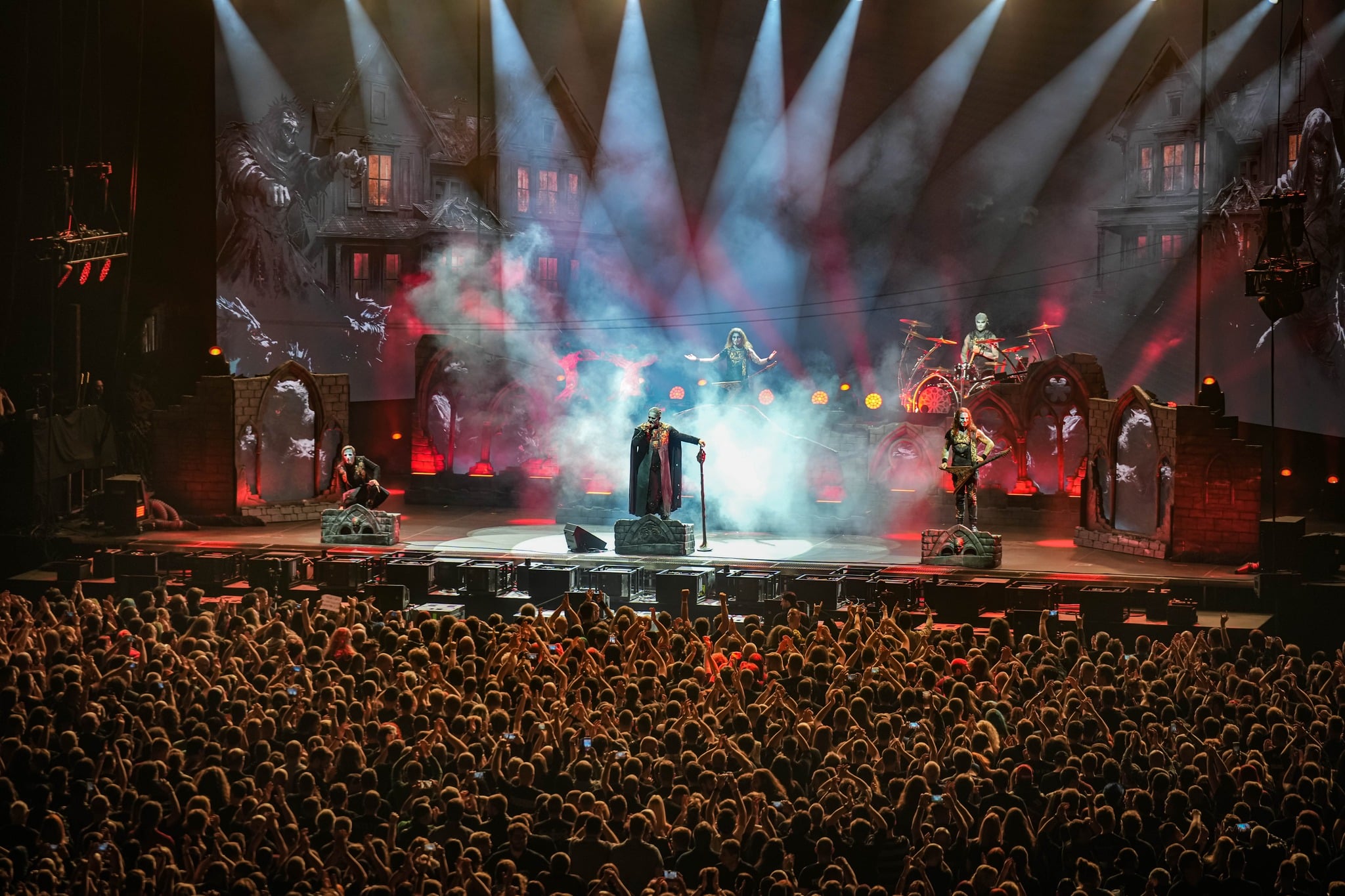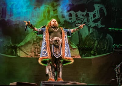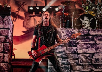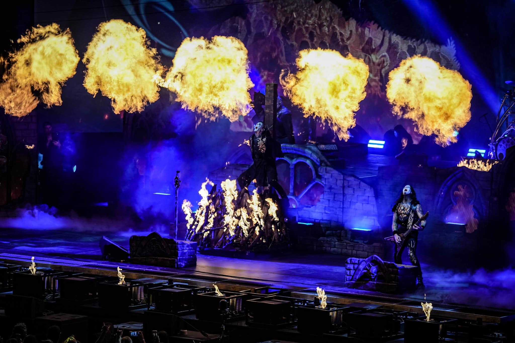 Pontos kezdés után, ahogy egyébként a másik két zenekar is, lehullott a függöny, és élénk tárult egy hatalmas templomot idéző színpadkép, régen nem látott méretű ledfallal a háttérben, amin folyamatosan animált, témába vágó képet kaptunk, természetesen nem kis mennyiségű tűzijáték és lángcsóva kíséretében. Nehéz leírni a látványt, inkább nézzétek végig a koncerten készült galériánkat, a képek ömagukért beszélnek. Aki látta a csapat pandémia alatt készült Monumental Mass kiadványát, ami az itthoni Raktár koncertek kicsit nagyobb volumenű megfelelője a Powerwolf esetében, annak nagyjából ugyanezt kell elképzelni, csak 3 dimenzióban és kicsit hangosabban. 16+3 számos setlist, két órás farkaskodás, eszméletlen hangulat. Nem maradt el a “most ketté választom a közönséget mint Mózes a tengert”, jobb és baloldali közönség énekeltetés sem. Kollégánk készített egy rövidke videót is, mely igyekszik összefoglalni ezt a fantasztikus élményt, amit leírni inehezen tudunk. A videót ITT ÉRITEK EL.