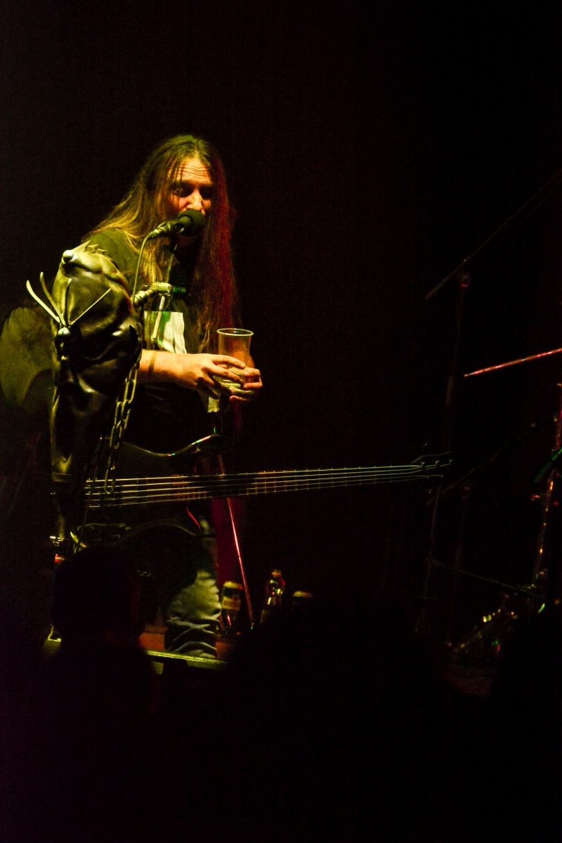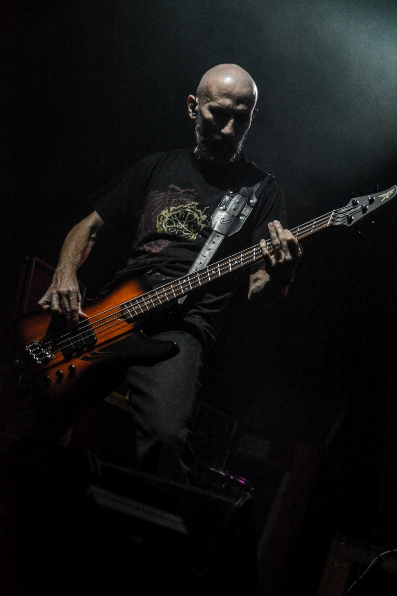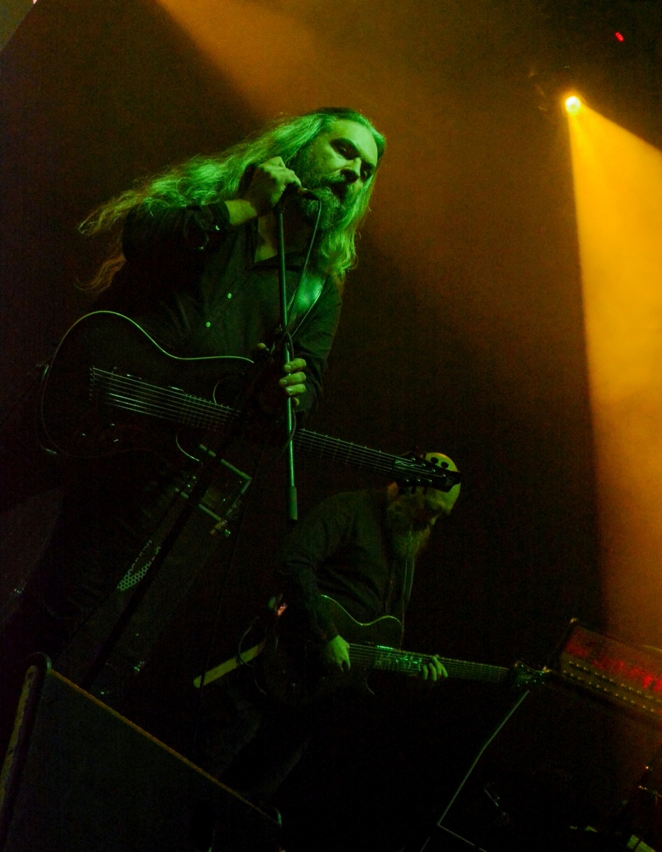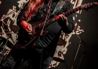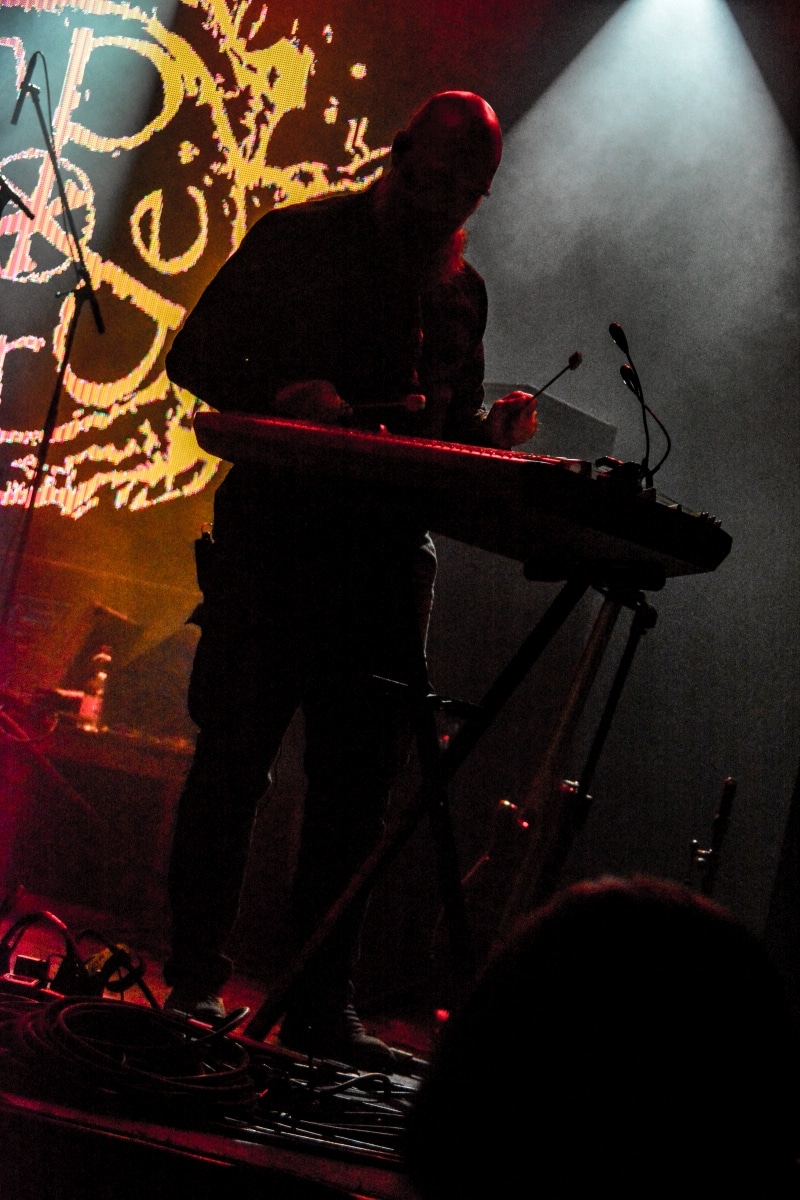 Erre az estére összesen két fellépőt vártunk: értelemszerűen a születésnapos Sear Bliss-t, és – mivel lehetett tudni, hogy meglehetősen hosszú setlist-tel fognak érkezni – így csak egy vendég zenekarnak marad hely aznap estére: a születésnapos választása a román Dordeduh-ra esett. Az előzetes elképzelés az volt, hogy a román banda kétséget kizáróan emelni fogja az est fényét, és ezt a várakozást csak megerősíteni lehet. Imádom a Dordeduh-ot, mind a zenészeket, mind a zenét. A kapcsolatunk nem túl szoros, viszont régi: nem egyszer láttam őket még Negură Bunget-ként fellépni Budapesten, és már akkor is elemi erővel hatott rám az a teljesen egyedi légkör, amit megteremtették. A nagy válás után a légkör egyedisége megmaradt, jellege talán egy picit változott, de továbbra is teljesen lebilincselő volt, amit hallhatunk. Most csökkentett létszámmal érkezett a Dordeduh, azaz két gitár – basszus – dob felállásban léptek föl – nem úgy, mint a Thy Catafalque előzenekaraként a 2021-es Mezolit-koncerten. Kristálytisztán szóltak, és ez az ő zenéjüknél eszméletlenül fontos: itt a harmóniákkal és a zene dinamikájával-hangerejével való játék kulcsfontosságú a zenei élmény szempontjából; ha valami nem szól rendesen, akkor az egész fellépés tulajdonképpen csapnivaló lesz. És igen, imádom azt is, ahogy ez a négy figura zenél. Edmond Karban mint egy hatalmas oroszlán penget-énekel és ordít, a jobbján a nyakigláb Flavius basszusgitáros játszik teljesen átszellemülten, balra pedig a kopasz szakállas Christian Popescu, aki villogó tekintettel hol a gitár nyakát nézi, hol pedig a mellette lévő cimbalmot. A dalaik alapvetően lassúak és viszonylag hosszúak – mivel pedig setlist nem állt rendelkezésre, így többen próbáltuk kitalálni, hogy pontosan mi is hangzott el és összesen hány tétel, de nem tiszta, hogy öt vagy hat dalt játszottak (a kollektív megfejtés a Timpul întâilor, Desferecat, Descânt, De neam vergur, În vieliștea uitării, Jind de tronuri lett). Ami tény, hogy alapvetően a Har album tételei dominálták ezt a fellépést – ha a kedves olvasó véletlenül nem tette volna meg az eddigiekben, úgy feltétlenül javaslom minél alaposabban meghallgatni ezt az anyagot. Ami a fellépés külön szépségét adta, az két, határokon és kultúrákon átívelő gesztus. Az egyik gesztus, hogy Edmond – igaz, hogy tört magyarsággal, de – egészen hosszan magyarul beszélt a közönséghez, és a másik gesztus, hogy minden egyes ilyen felkonferálást a közönség zúgó tapssal jutalmazott.