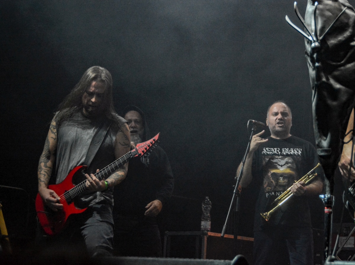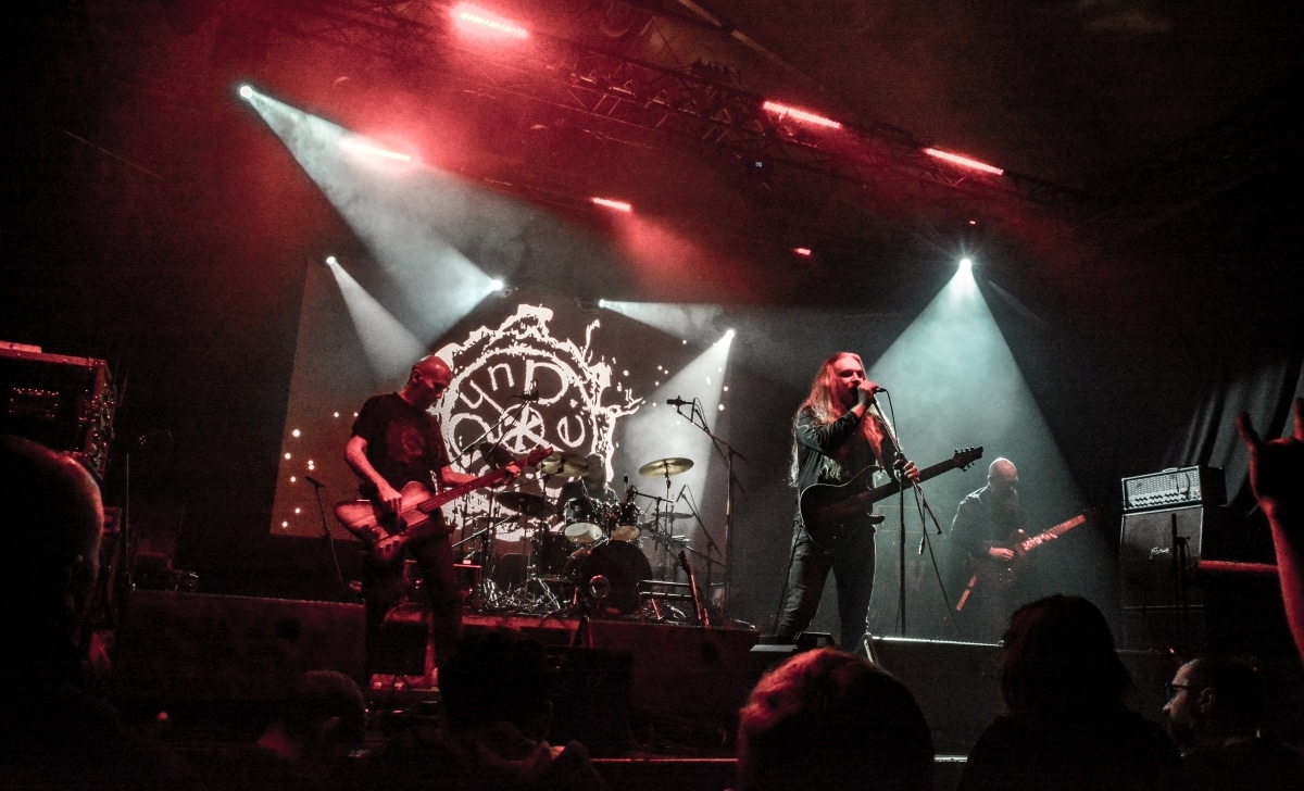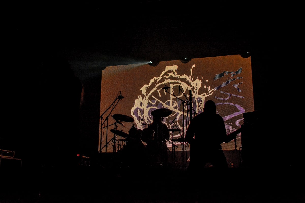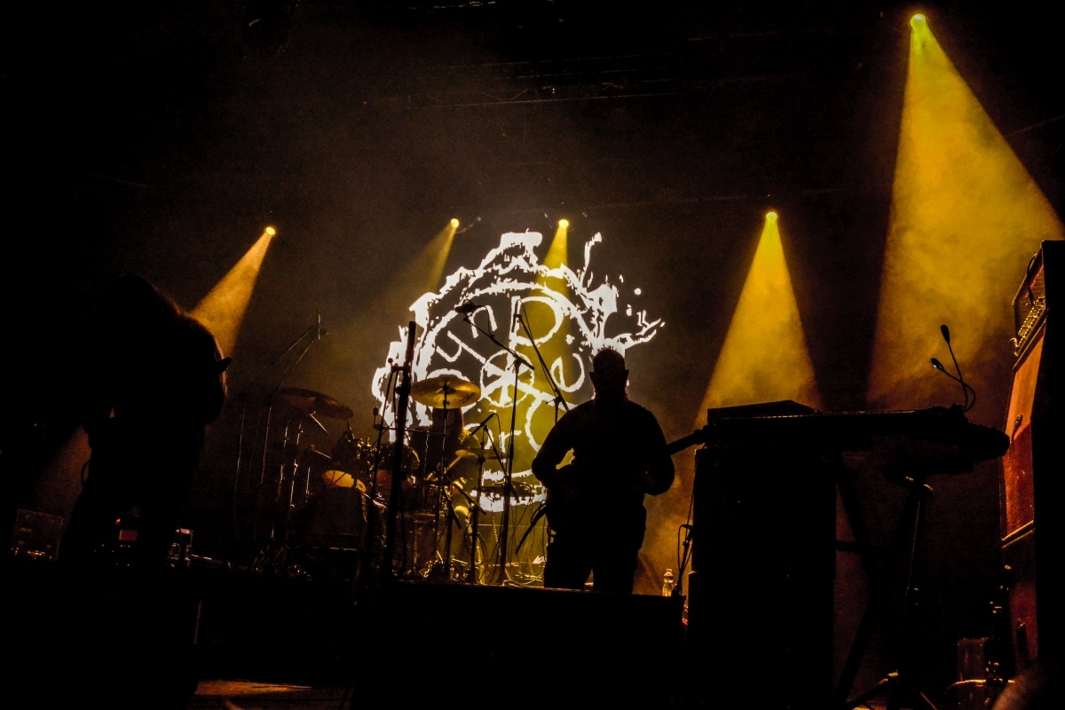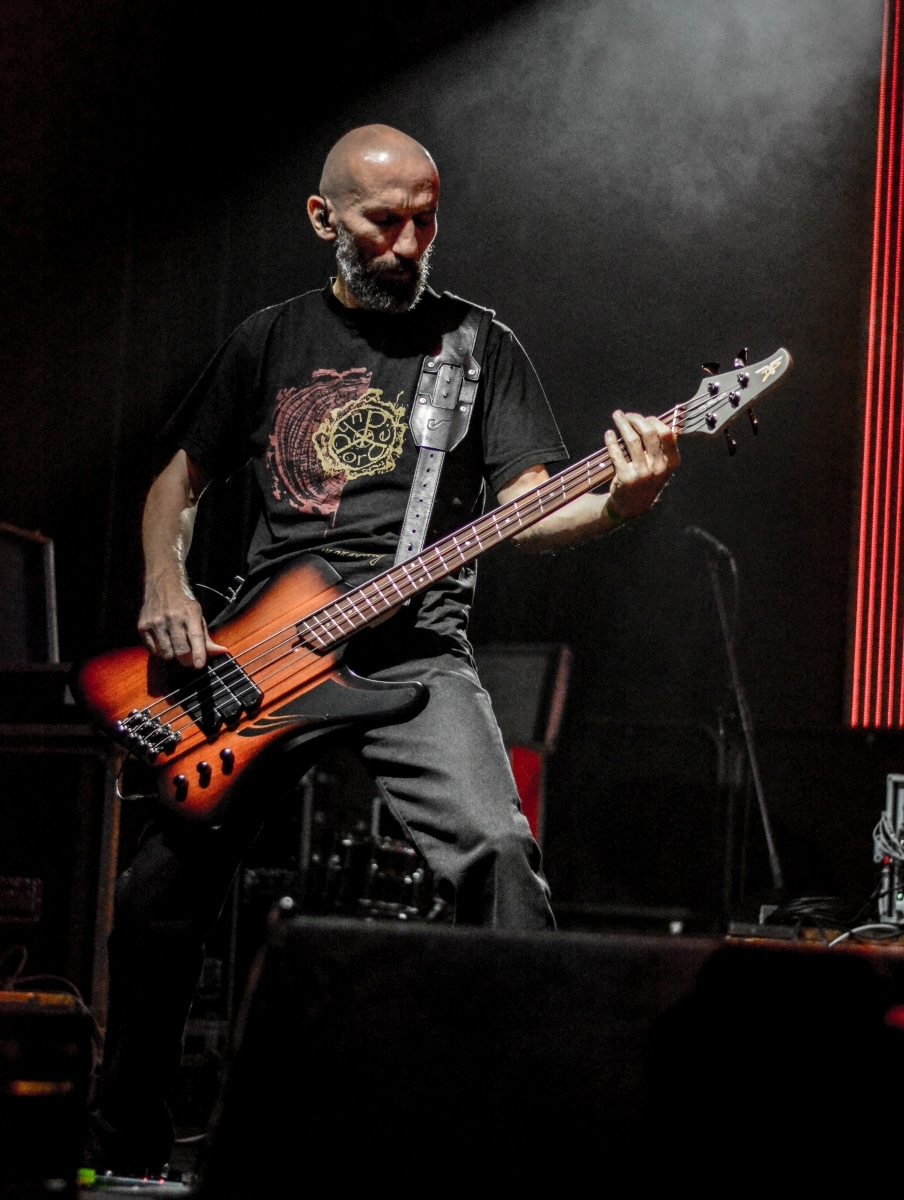 Erre az estére összesen két fellépőt vártunk: értelemszerűen a születésnapos Sear Bliss-t, és – mivel lehetett tudni, hogy meglehetősen hosszú setlist-tel fognak érkezni – így csak egy vendég zenekarnak marad hely aznap estére: a születésnapos választása a román Dordeduh-ra esett. Az előzetes elképzelés az volt, hogy a román banda kétséget kizáróan emelni fogja az est fényét, és ezt a várakozást csak megerősíteni lehet. Imádom a Dordeduh-ot, mind a zenészeket, mind a zenét. A kapcsolatunk nem túl szoros, viszont régi: nem egyszer láttam őket még Negură Bunget-ként fellépni Budapesten, és már akkor is elemi erővel hatott rám az a teljesen egyedi légkör, amit megteremtették. A nagy válás után a légkör egyedisége megmaradt, jellege talán egy picit változott, de továbbra is teljesen lebilincselő volt, amit hallhatunk. Most csökkentett létszámmal érkezett a Dordeduh, azaz két gitár – basszus – dob felállásban léptek föl – nem úgy, mint a Thy Catafalque előzenekaraként a 2021-es Mezolit-koncerten. Kristálytisztán szóltak, és ez az ő zenéjüknél eszméletlenül fontos: itt a harmóniákkal és a zene dinamikájával-hangerejével való játék kulcsfontosságú a zenei élmény szempontjából; ha valami nem szól rendesen, akkor az egész fellépés tulajdonképpen csapnivaló lesz. És igen, imádom azt is, ahogy ez a négy figura zenél. Edmond Karban mint egy hatalmas oroszlán penget-énekel és ordít, a jobbján a nyakigláb Flavius basszusgitáros játszik teljesen átszellemülten, balra pedig a kopasz szakállas Christian Popescu, aki villogó tekintettel hol a gitár nyakát nézi, hol pedig a mellette lévő cimbalmot. A dalaik alapvetően lassúak és viszonylag hosszúak – mivel pedig setlist nem állt rendelkezésre, így többen próbáltuk kitalálni, hogy pontosan mi is hangzott el és összesen hány tétel, de nem tiszta, hogy öt vagy hat dalt játszottak (a kollektív megfejtés a Timpul întâilor, Desferecat, Descânt, De neam vergur, În vieliștea uitării, Jind de tronuri lett). Ami tény, hogy alapvetően a Har album tételei dominálták ezt a fellépést – ha a kedves olvasó véletlenül nem tette volna meg az eddigiekben, úgy feltétlenül javaslom minél alaposabban meghallgatni ezt az anyagot. Ami a fellépés külön szépségét adta, az két, határokon és kultúrákon átívelő gesztus. Az egyik gesztus, hogy Edmond – igaz, hogy tört magyarsággal, de – egészen hosszan magyarul beszélt a közönséghez, és a másik gesztus, hogy minden egyes ilyen felkonferálást a közönség zúgó tapssal jutalmazott.