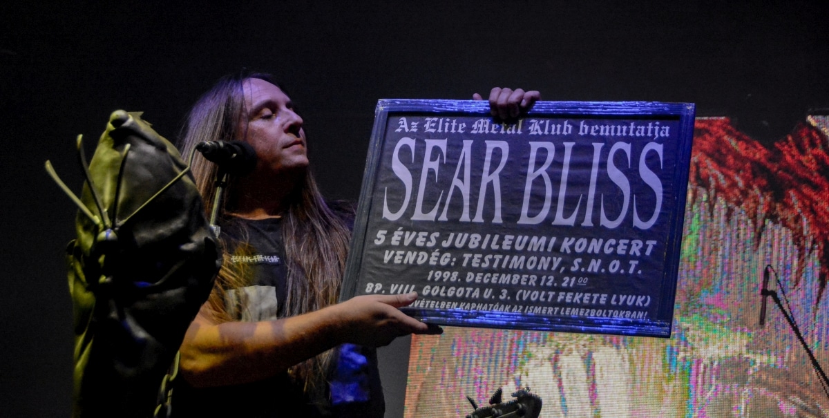 Miután a beszámoló kötelező része le lett tudva, jöjjön a kezdetek kezdetén emlegetett síkokból az a másik, a személyesebb, emocionálisabb – azaz miért is íródik egy ilyen beszámoló? Számomra ez egy valós időben lejátszódó időutazás volt, és mivel az egész este során egyetlen egy sört ittam, nagyon boldog vagyok, hogy minden apró részletre emlékezhetek. Én a The Haunting-gal kezdtem a Sear Bliss-es pályafutásomat, és – középiskola végén, amikor az ember eléggé fogékony – egészen egyszerűen megrázott az, hogy ennyire egyedi hangzás egyáltalán létezhet. Ekkortájt már javarészt extrém metal-t hallgattam – vastagon túlvoltunk a Morbid Angel ABCD albumain –, de a mai napig féltve őrzött és hullámosra hallgatott The Haunting kazetta valami egészen elementáris hatást váltott ki belőlem. A történet folytatását a jelenlévőkkel kellett összelegózni: Bandó kapott egy plakátot az ötéves születésnapi buliról, ami a Fekete Lyukban volt a Testimony-val mint előzenekarral – na erre emlékeztem, ott voltam. Sikerült felidézni egy másik bulit is, ugyanitt, amikor a Tormentor volt a főzenekar, Attila usankában és egy harcsával (a vállán vagy a fején, erről megoszlottak a vélemények) lépett fel – ez egy fantasztikus, a fellépők számára eléggé kalandos este volt. Erről a koncertről egy életre szóló emlék kivakarhatatlanul beleégett a memóriámból: ez annak a nyakigláb gitárosnak a látványa, aki a színpad szélén teljesen átszellemült arccal játszott a nagyjából térdig leeresztett gitáron anélkül, hogy szólózás közben akárcsak rá is nézett volna a hangszerre – mint most sikerült tisztázni, ez Max volt (Scheer Viktor), akivel kapcsolatban én minimum öt évig sziklaszilárdan meg voltam győződve, hogy ő biztosan holland, mert hát biztosan… mindenesetre ezek nem mai események voltak. Azzal együtt, hogy többé-kevésbé folyamatosan hallgattam a Sear Bliss zenéjét, voltak itt is mélypontok. Nekem például a Forsaken Symphony és a The Arcane Odyssey között kicsit háttérbe szorultak, a The Arcane Odyssey-nél viszont valahogy annyira sikerült elkapni a fonalat, hogy az az album is letehetetlennek bizonyult – emlékszem a helyiek nagy örömére, amikor a munka során folyamatosan ez ordított a terepjáróban, hol máshol, mint az ománi sivatagban. Aztán persze lehetne ragozni a ’tetszik’ meg a ’kevésbé tetszik’ albumok hosszú sorát, de nem is ez a lényeg, hanem az, hogy ezt a rendszert harminc éven keresztül valahogy mi működtetni kellett. Ma a zenekar „csak” beül a kocsiba és eljön fellépni, de hogy ezt meg lehessen tenni, az mindenki részéről a folyamatos áldozatvállalást, a folyamatos pengeélen táncolást és a folyamatos időnyomás alatti működést jelenti.