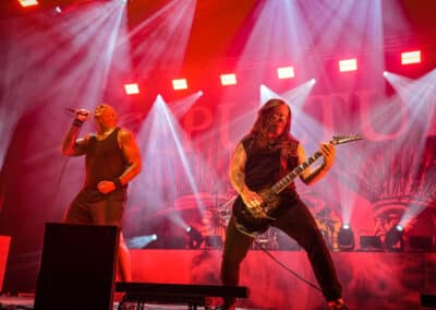 Hogy milyen albumok lehetnek a Sepultura működésének alapvetéseit, azzal azért a zenekar tagsága is tisztában volt: a hosszú, jó pár percnyi intrókat követően azonnal belecsaptunk a lecsóba, és a Chaos A.D. legnagyobb dalai kezdtek kell pörögni – gondolom, nem kell említeni, hogy a reakció sem maradt el: a harmadik sor környékén az egész embermassza egy ütemre ugrálta végig ezeket a számokat. A továbbiakban – legalábbis a fellépés első felében – egy meglehetősen vegyes válogatás követ között a zenekar korábbi munkáiból, de igazából ugrálás vagy pedig jelentősebb ováció a korábbi anyagokat kísérte (Refuse/Resist, Territory, Slave New World, Phantom Self, Attitude, Means to an End, Kairos, Corrupted, Guardians of Earth, Choke, False, Escape to the Void, Kaiowas, Orgasmatron, Dead Embryonic Cells, Agony of Defeat, Troops of Doom, Inner Self, Arise, Ratamahatta, Roots Bloody Roots). Nagyjából a buli egyharmadánál tűnt föl, hogy a hang messze van az ideálistól – a Sepultura zenéje alapvetően két gitárra íródott, és a két hangszer hangjának dinamikája az, ami megadja a zene lendületét. Ráadásul csomó esetben a két gitár mást is játszik – nem is beszélve a szólókról, ahol kíséret nélkül a világ legizgalmasabb szólója is csak furán lóg a levegőben. Talán az egyébként a Max utáni Sepultura egyik nagy rákfenéje, hogy egy gitárral – különösen a szólók esetén – nagyon nehéz combos és átütő hangzást összehozni. Nagyjából a műsor felénél következett a Kaiowas, ezzel a lehetőség szinte tálcán kínálkozott egy kis jammelésre, így az est összes korábbi fellépője a színpadra járulhatott dobkíséretet adni Andreas akusztikus gitárjátékához. Senki nem volt rest, még Paulo is dobütőt ragadott, és vígan püfölte a háttérben a tamokat. Ezután a lélegzetvételnyi szünet után természetesen folytatódott az életmű áttekintése a Sepultura alapvető slágereit egy-egy könnyedebb, kevésbé jelentőségteljes dallal vegyítve (az meg, hogy feldolgozás miért kellett aznap estére, maga a rejtély).