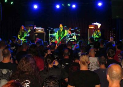 Helsotték alatt családias volt a hangulat, ám a kb. 20 perces átszerelést követően egyre több metálfejet láttunk. Mondjuk nem is csoda, hiszen a 70-es/80-as évek horror/gore filmjeinek hangulatát felelevenítő Necrophagia igen durván odapörkölt. Innentől kerültünk az esti buli hatása alá úgy igazán.